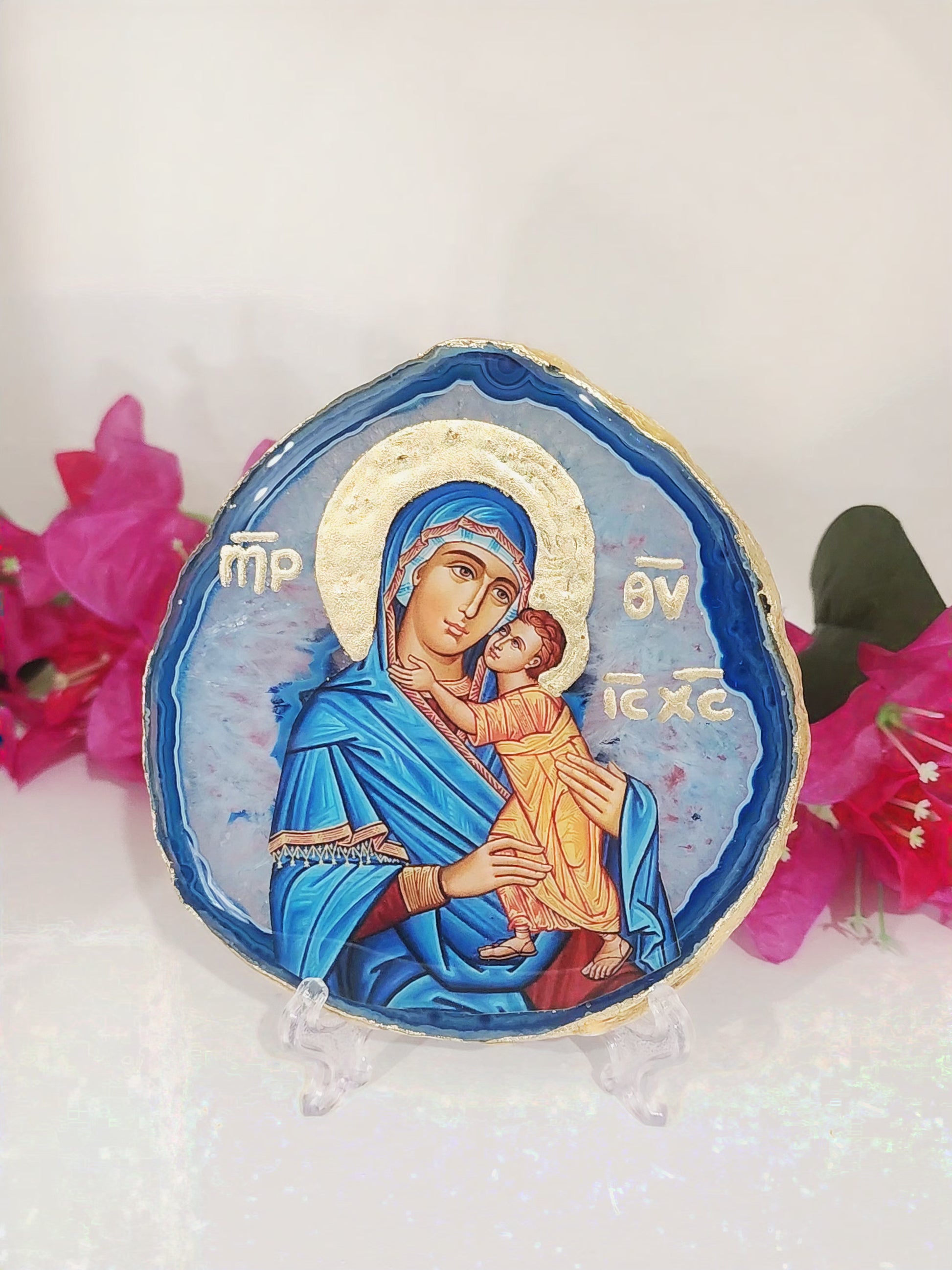 This beautiful icon of our Panagia is depicted on a 10.5cm blue Brazilian agate and adorned with radiant 24k gold leaf highlights.