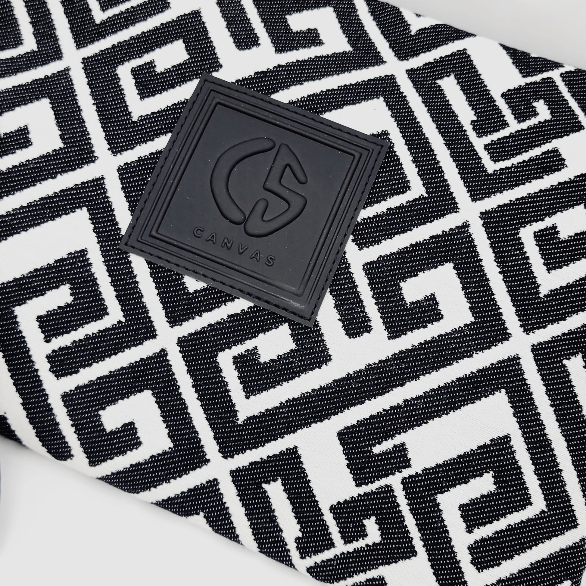 Exclusive to Apoéla Boutique, this stylish pouch combines durable canvas with leather accents featuring an eye-catching ancient Greek-inspired pattern.