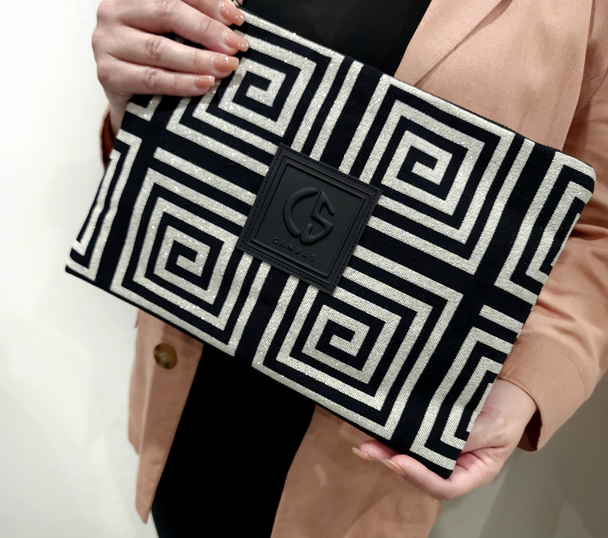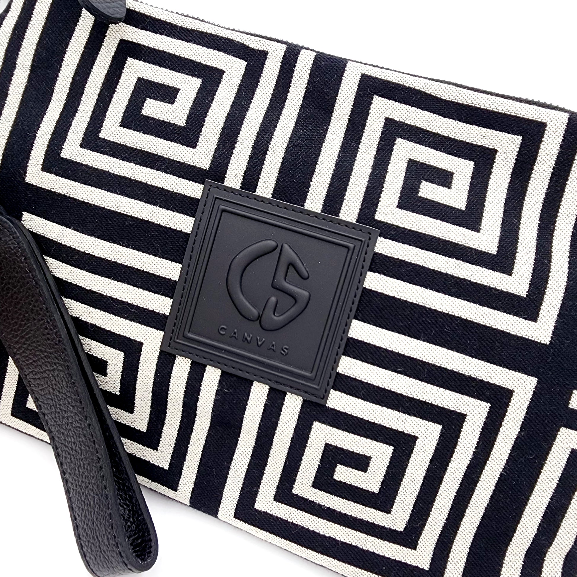 Exclusive to Apoéla Boutique, this stylish pouch combines durable canvas enhanced with shimmering gold and silver threads and finished with a sleek black leather strap.