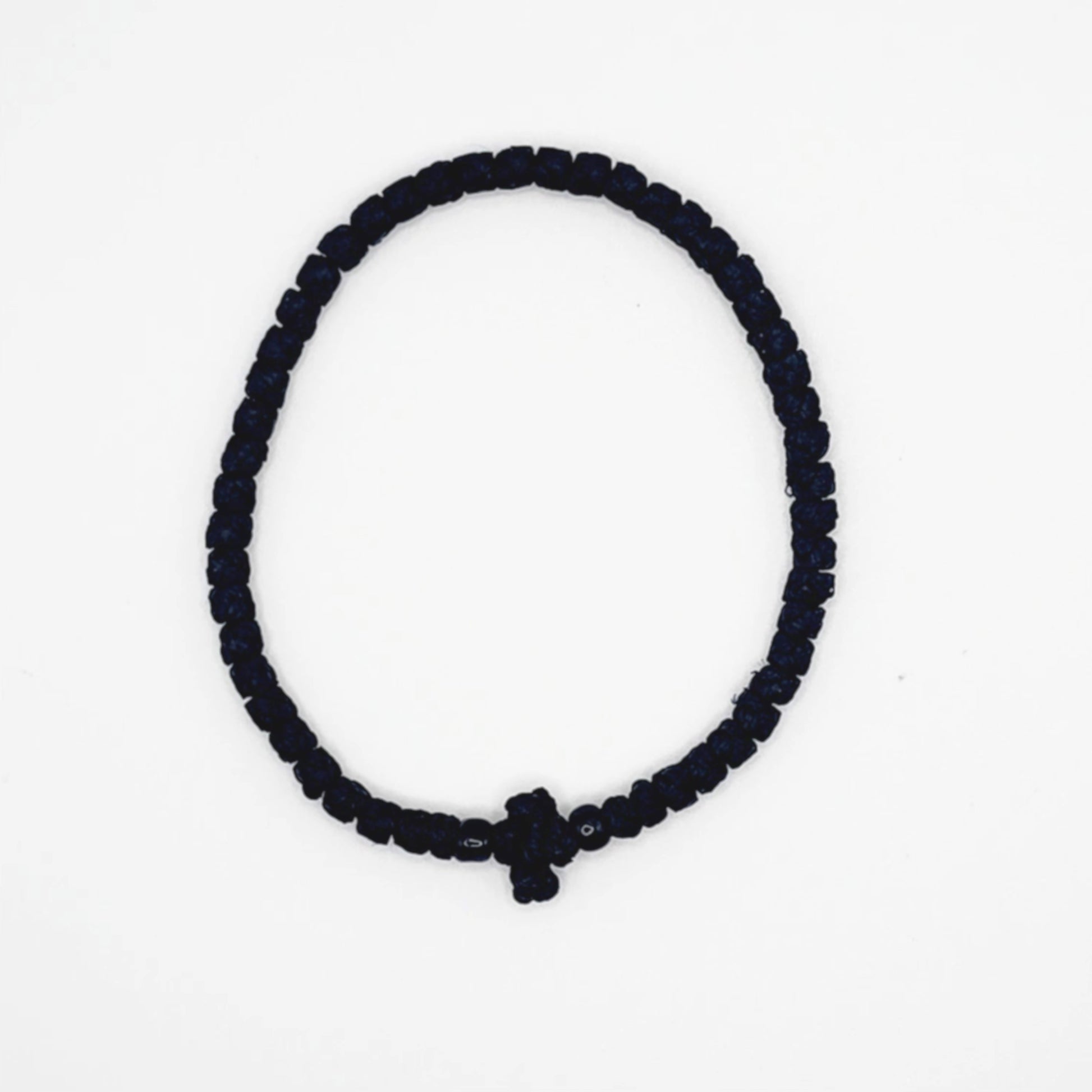 This handmade Komboskini features 33 knots crafted from black rope with two black beads accenting the design.