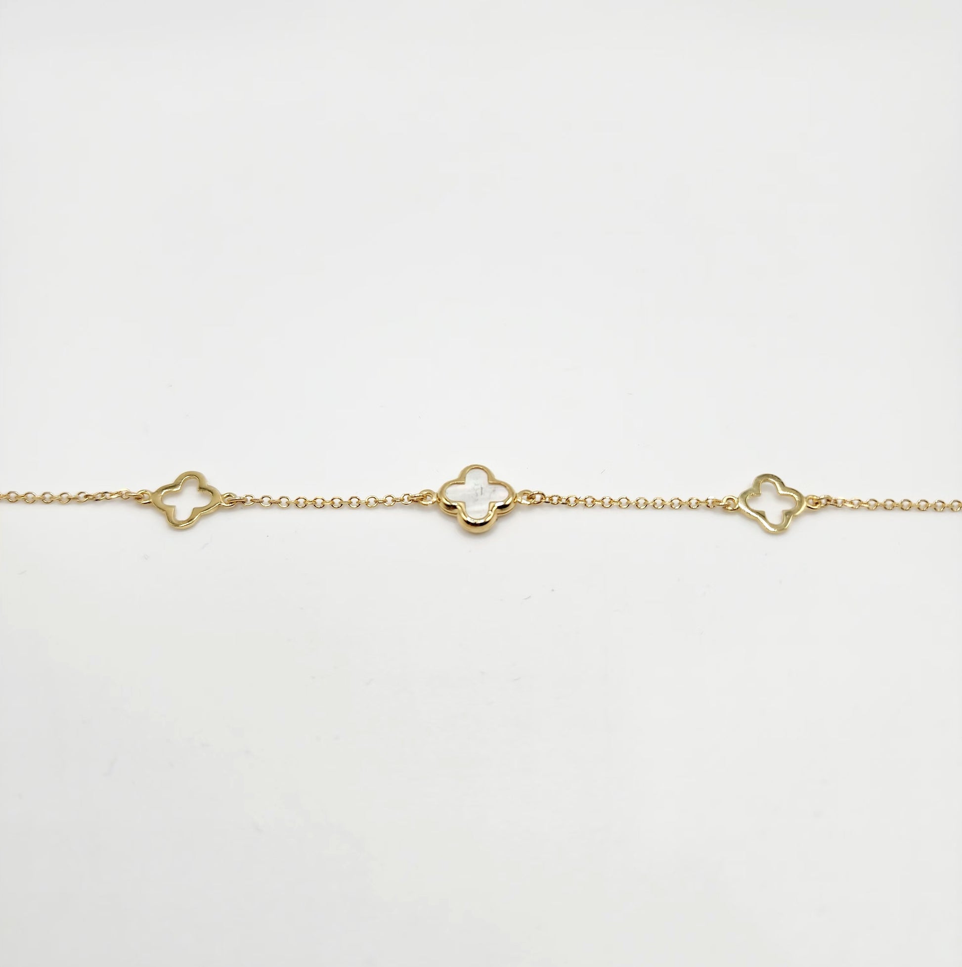 Elegant and timeless this 9ct yellow gold bracelet features three cross-shaped charms—two delicate open designs and one set with shimmering mother-of-pearl.
