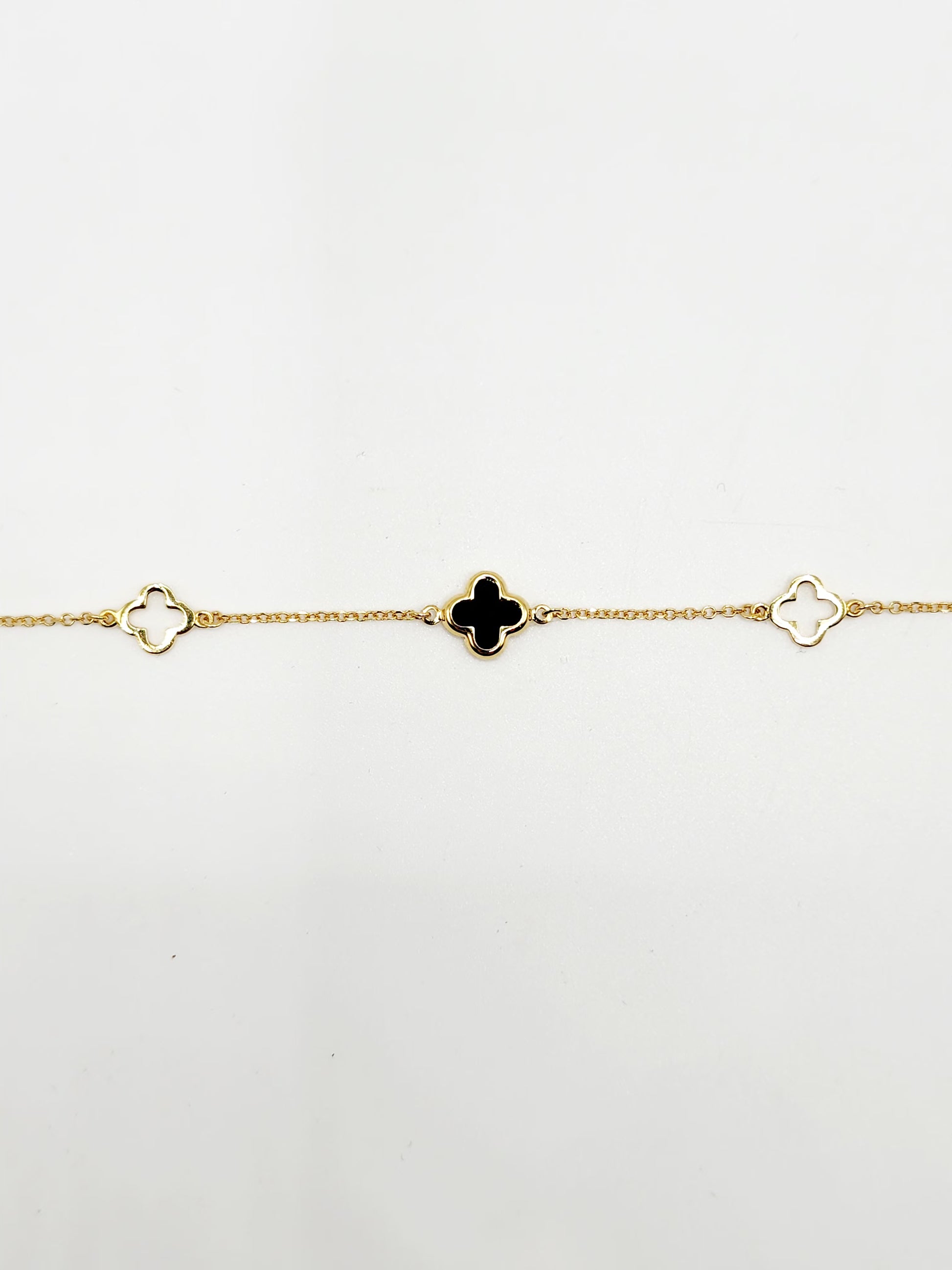 Elegant and timeless this 9ct yellow gold bracelet features three cross-shaped charms—two delicate open designs and one set with Black Onyx.