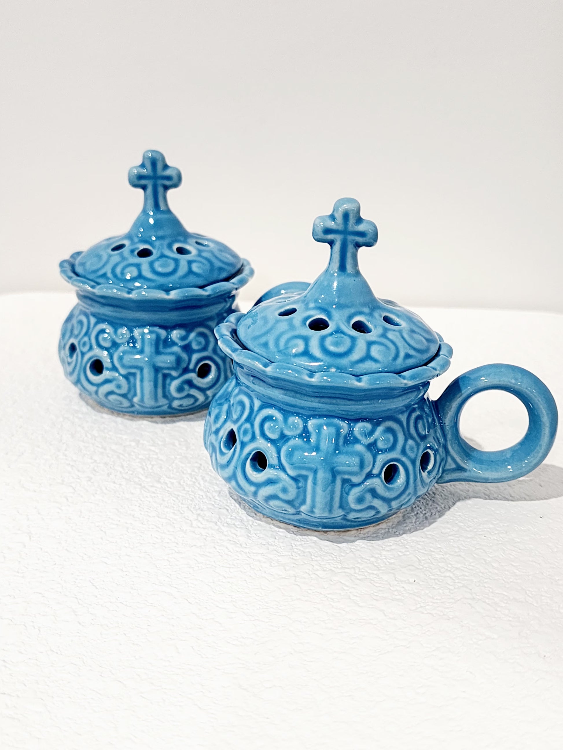 This richly glazed incense burner features a deep blue finish with elegant, raised detailing and a cross-shaped handle on the lid.