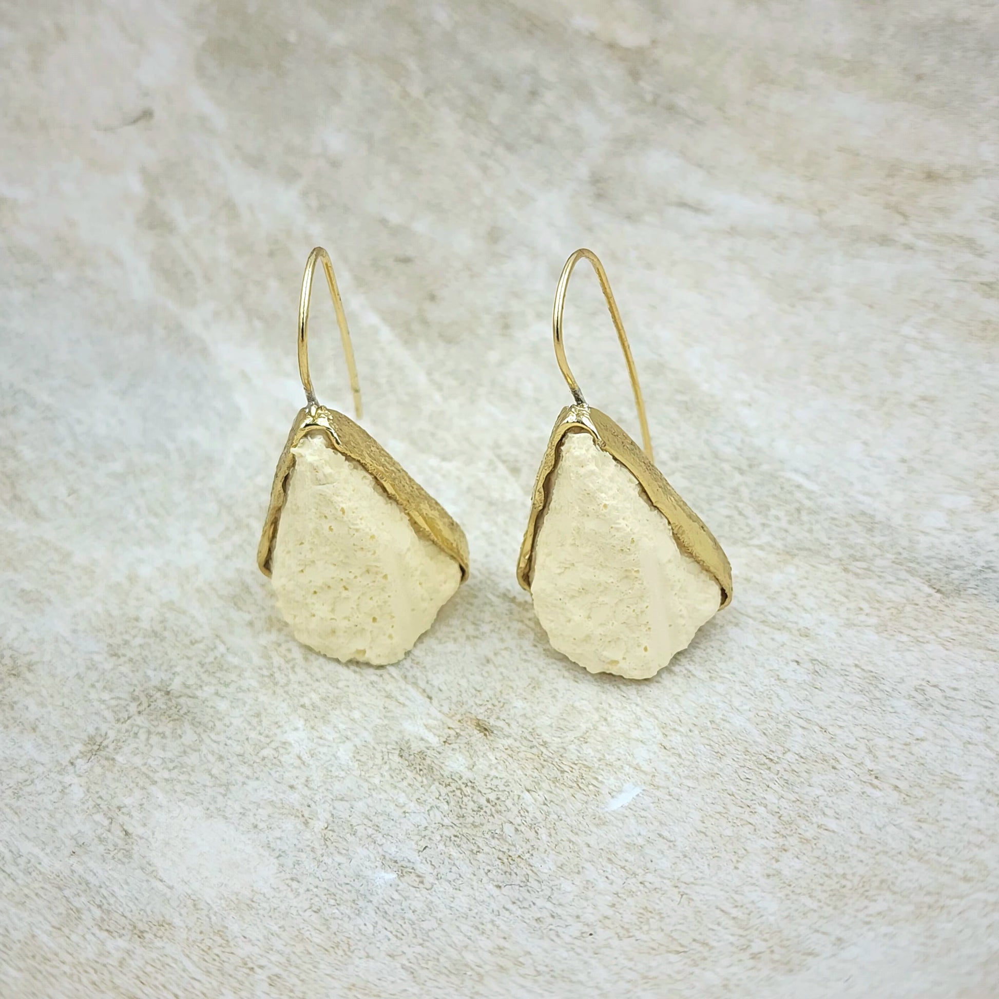 The earrings are crafted from ivory resin set against a smooth, golden frame.