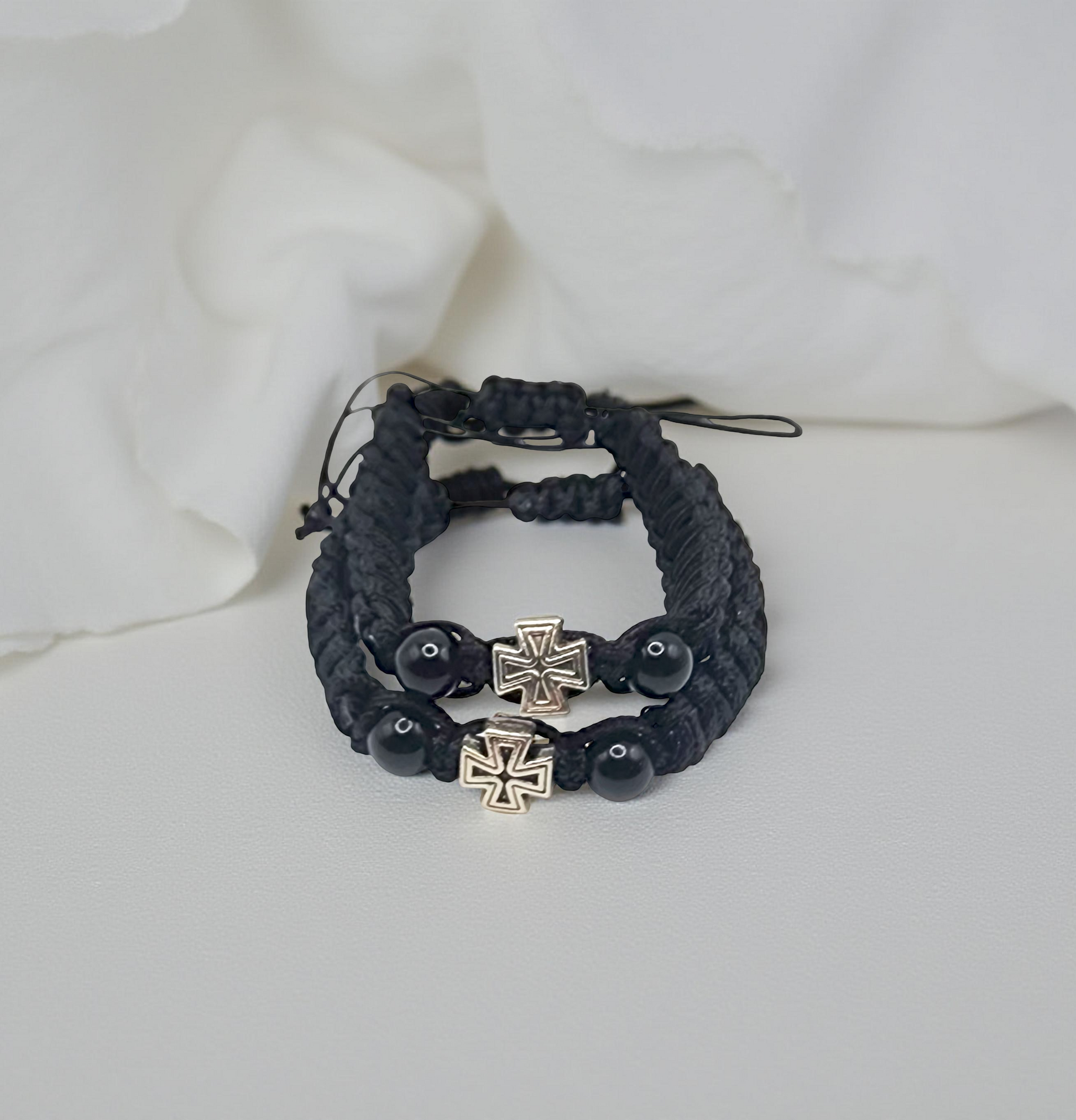 A sleek handwoven men's bracelet featuring black beads and a metallic cross charm. Adjustable and comfortable for everyday wear.