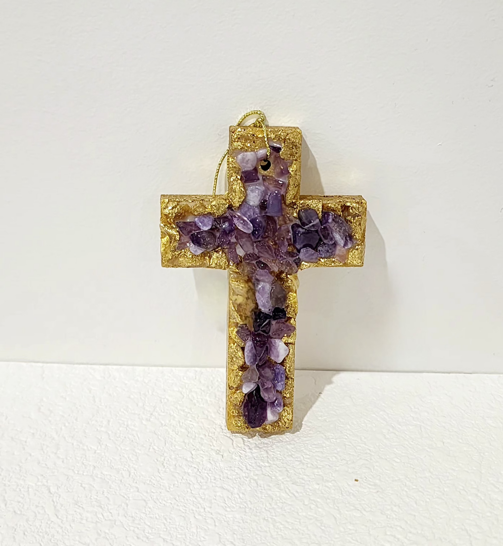 This beautiful handcrafted cross by Anesti Home features Amethyst stones and is edged with 24k gold leaf.