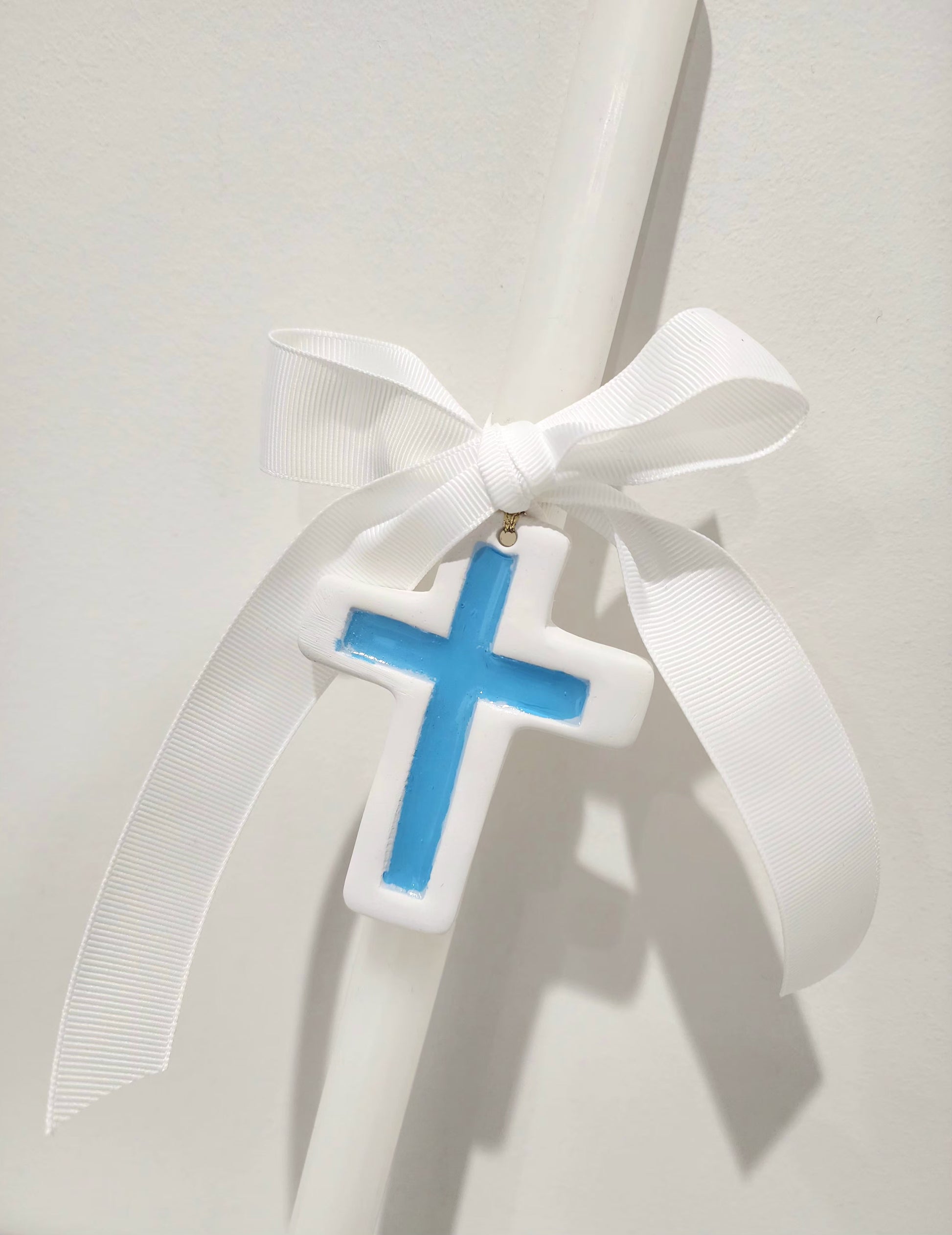 This Easter Lambatha is set on a 38cm white candle and features a handcrafted clay cross with a smooth blue resin centre.