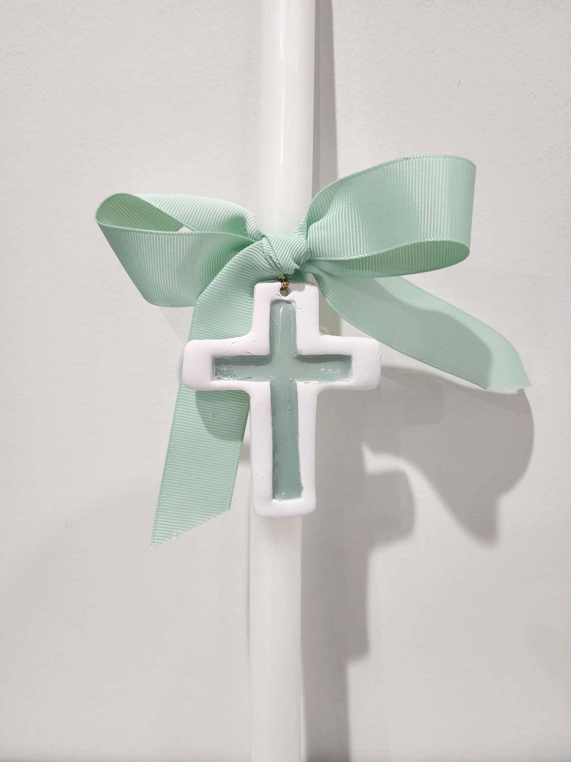 This Easter Lambatha is set on a 38cm white candle and features a handcrafted clay cross with a smooth mint green resin centre.