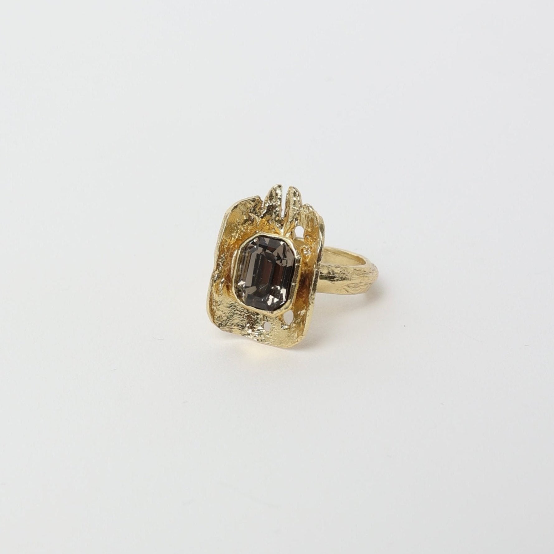 Radiant and bold, this striking ring features a rectangular center crystal set against a textured frame creating a balance of brilliance and intricate design.