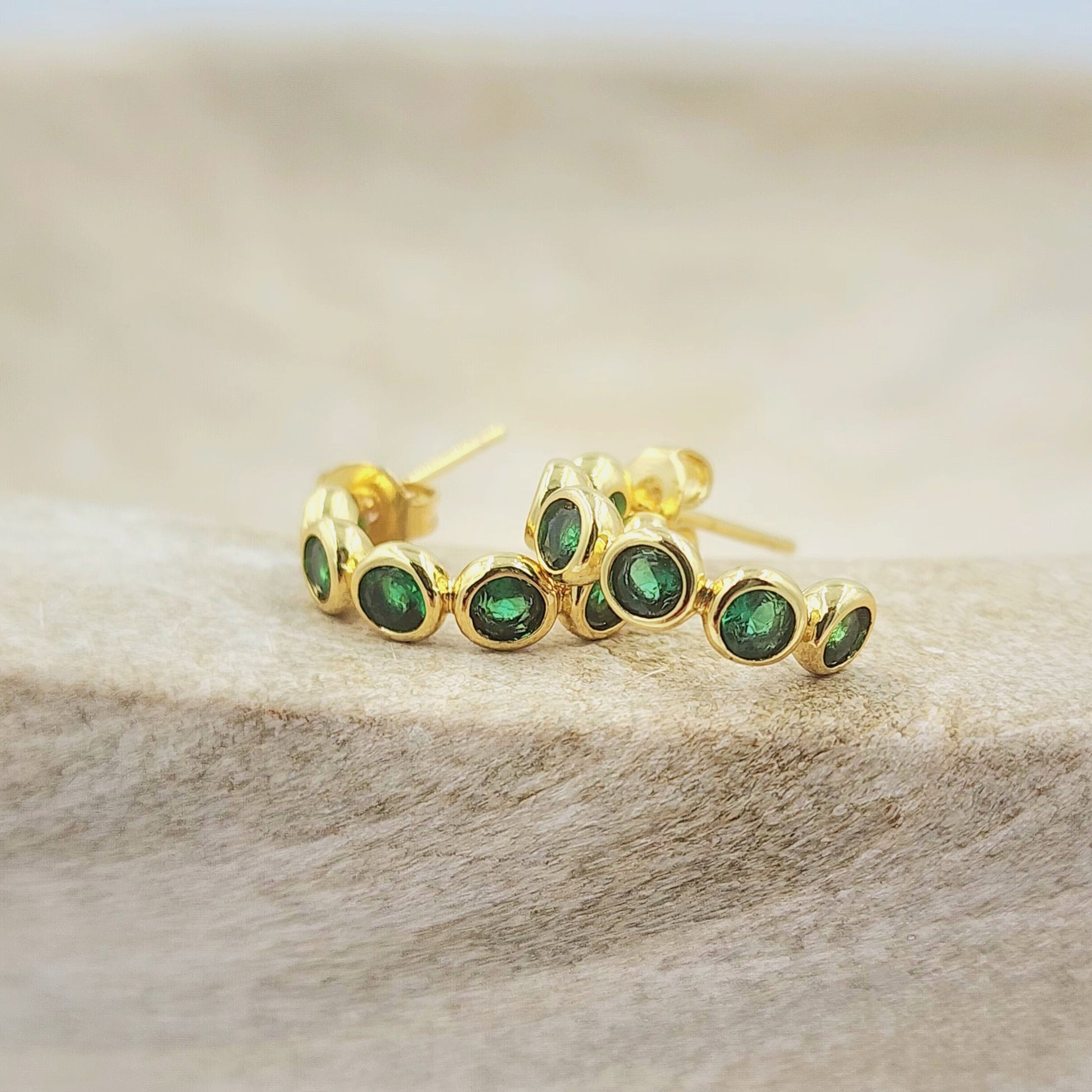 These elegant gold huggie hoops are adorned with six striking green zircon stones, adding a vibrant pop of color.