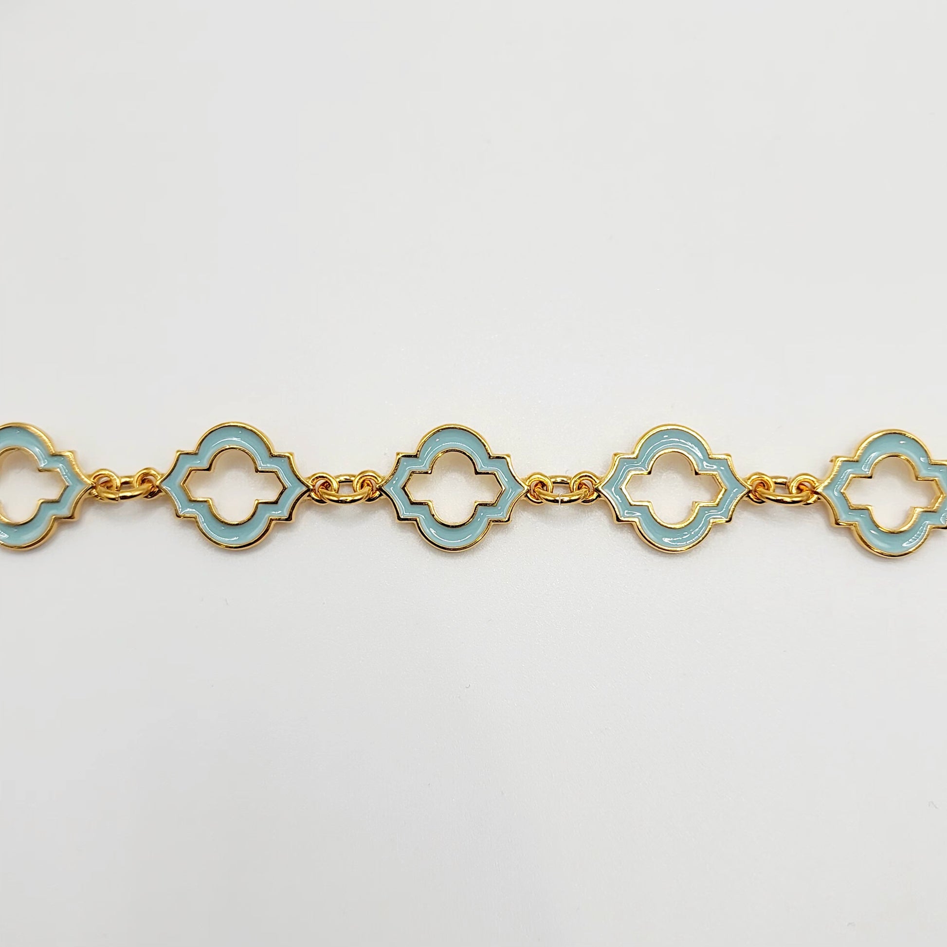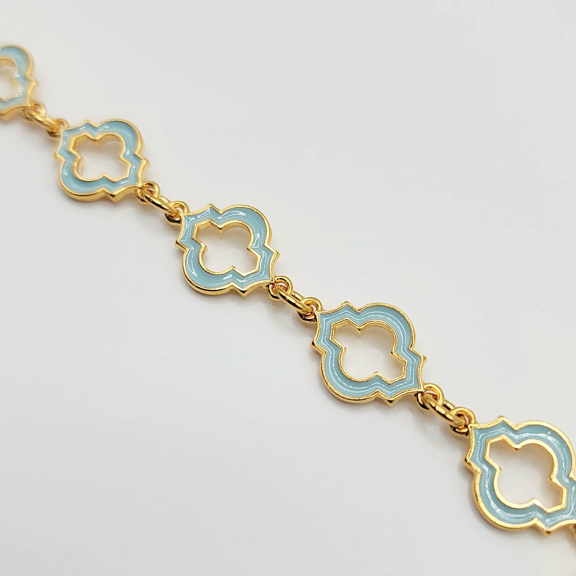 This stunning bracelet features a distinctive quatrefoil-inspired design accented with baby blue enamel for a soft modern touch.