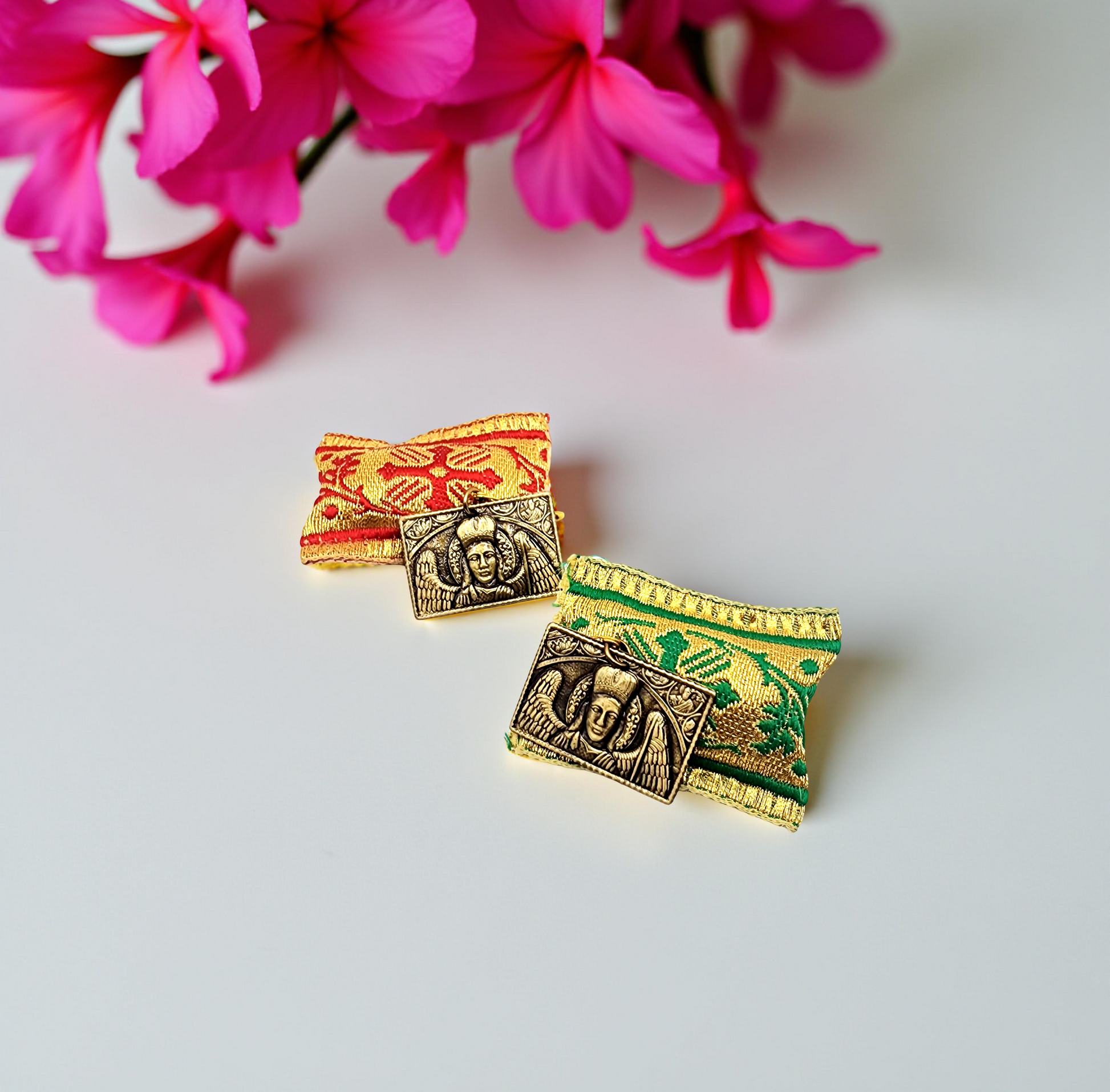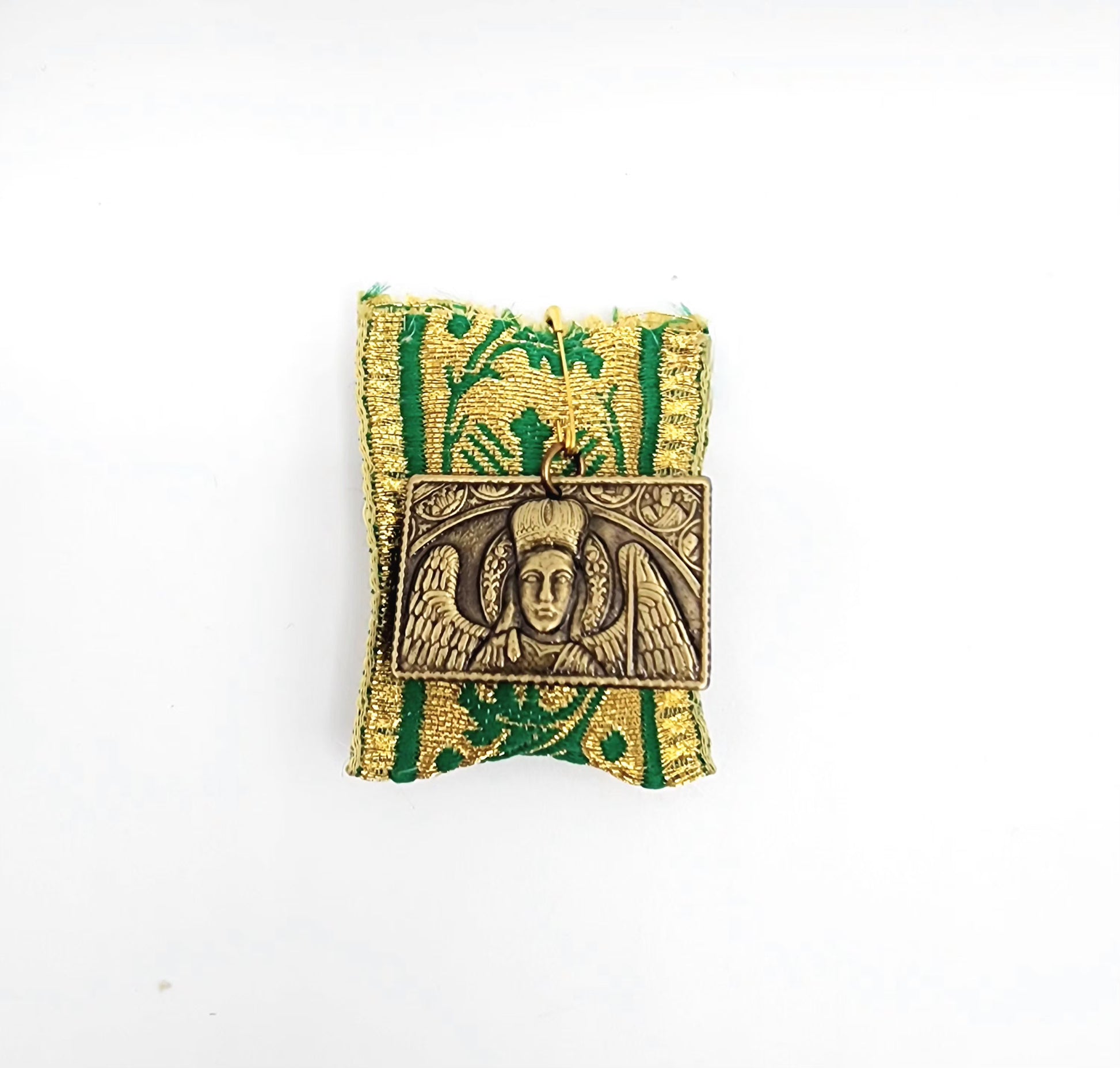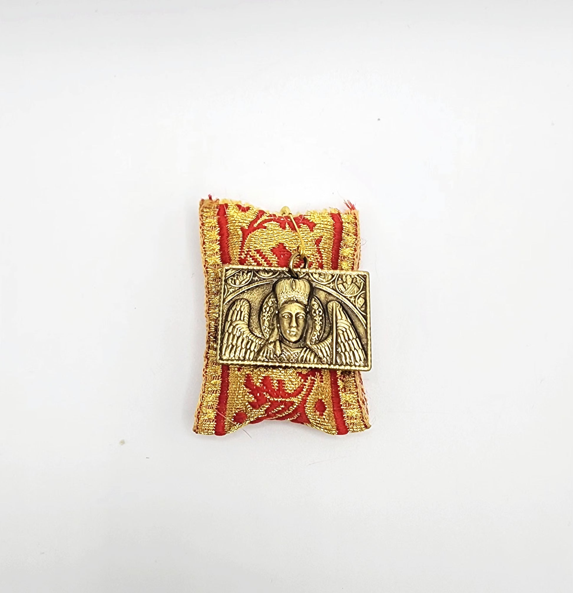 A beautiful handcrafted Orthodox filakto featuring Taxiarchi set against a rich woven fabric. Traditionally used for protection, this sacred keepsake is often placed in bags, cars, or given to loved ones during special occasions such as baptisms or travels.