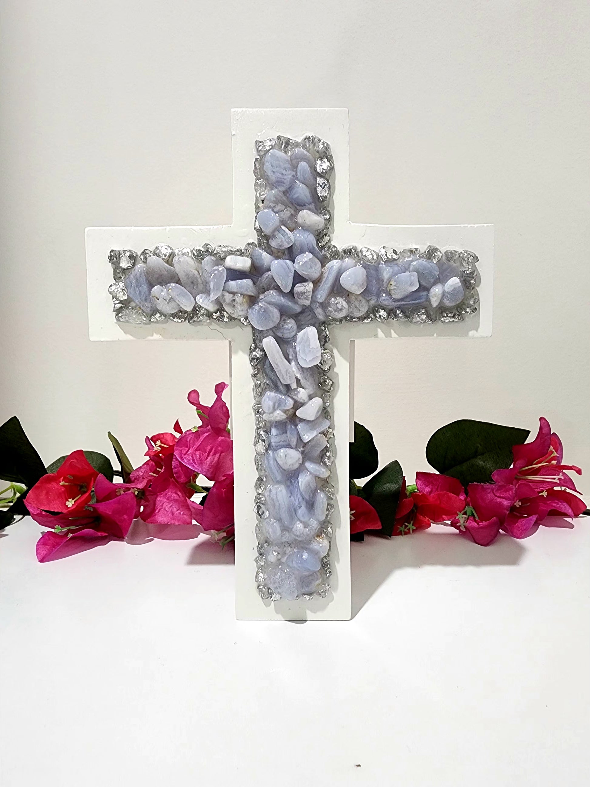 This beautiful handcrafted cross by Anesti Home features blue lace stones.