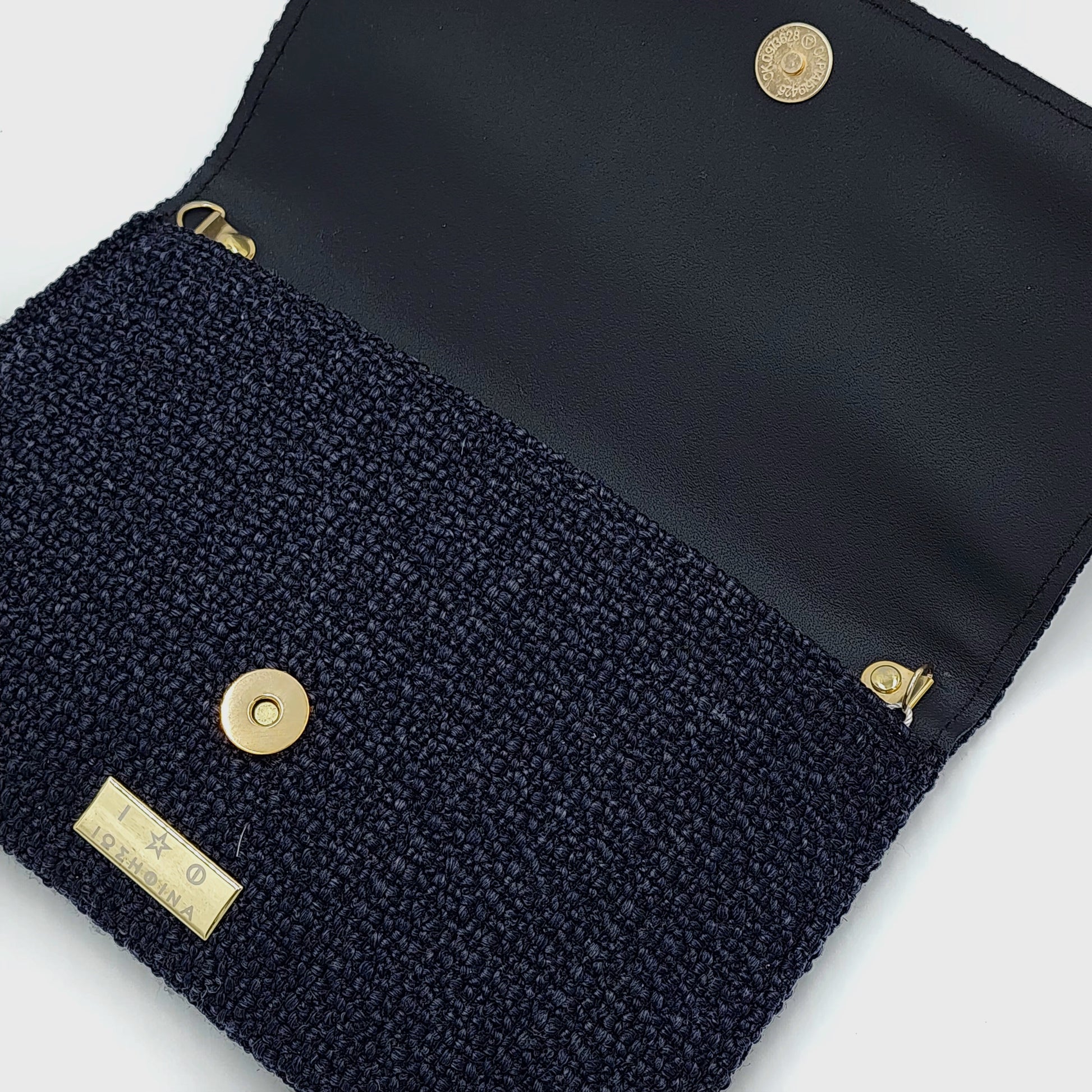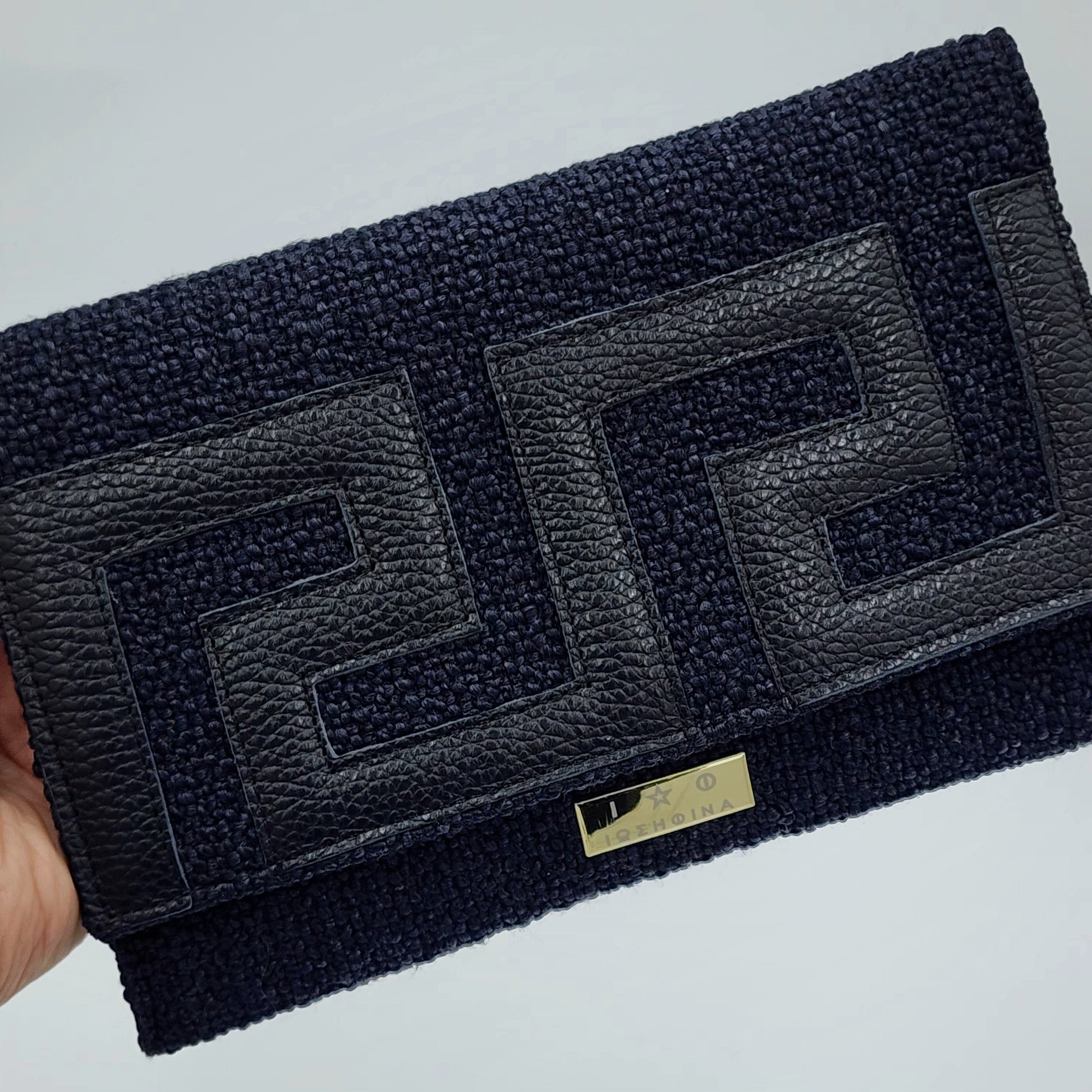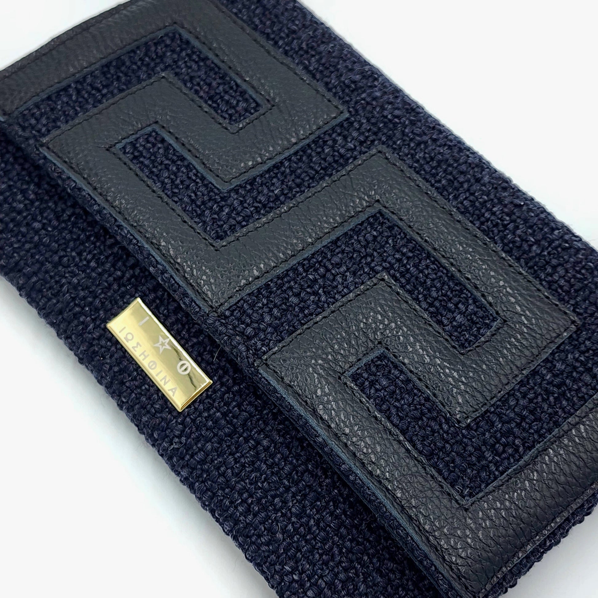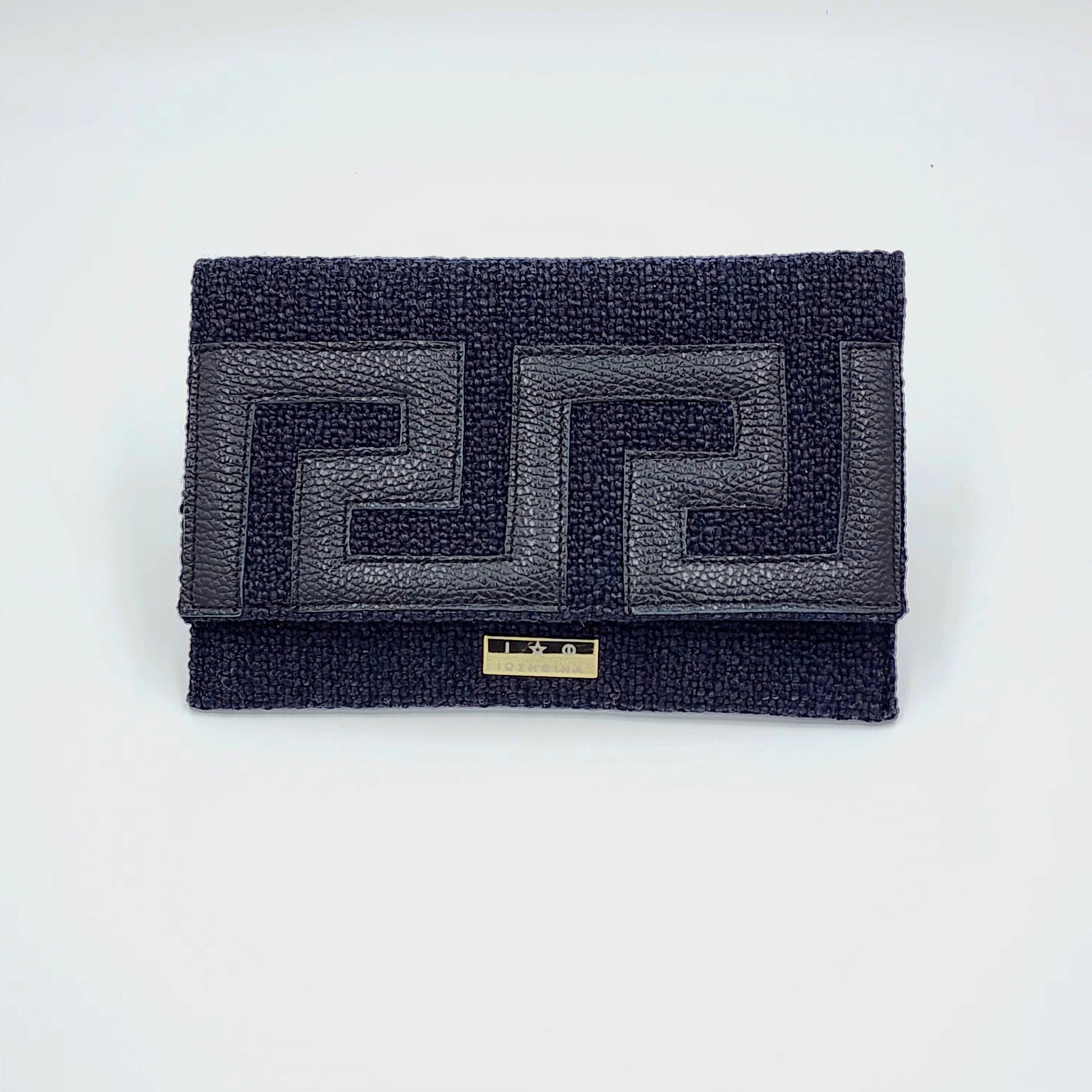 This chic black fabric clutch featuring a striking leather meander design brings a touch of ancient Greece to your modern wardrobe.