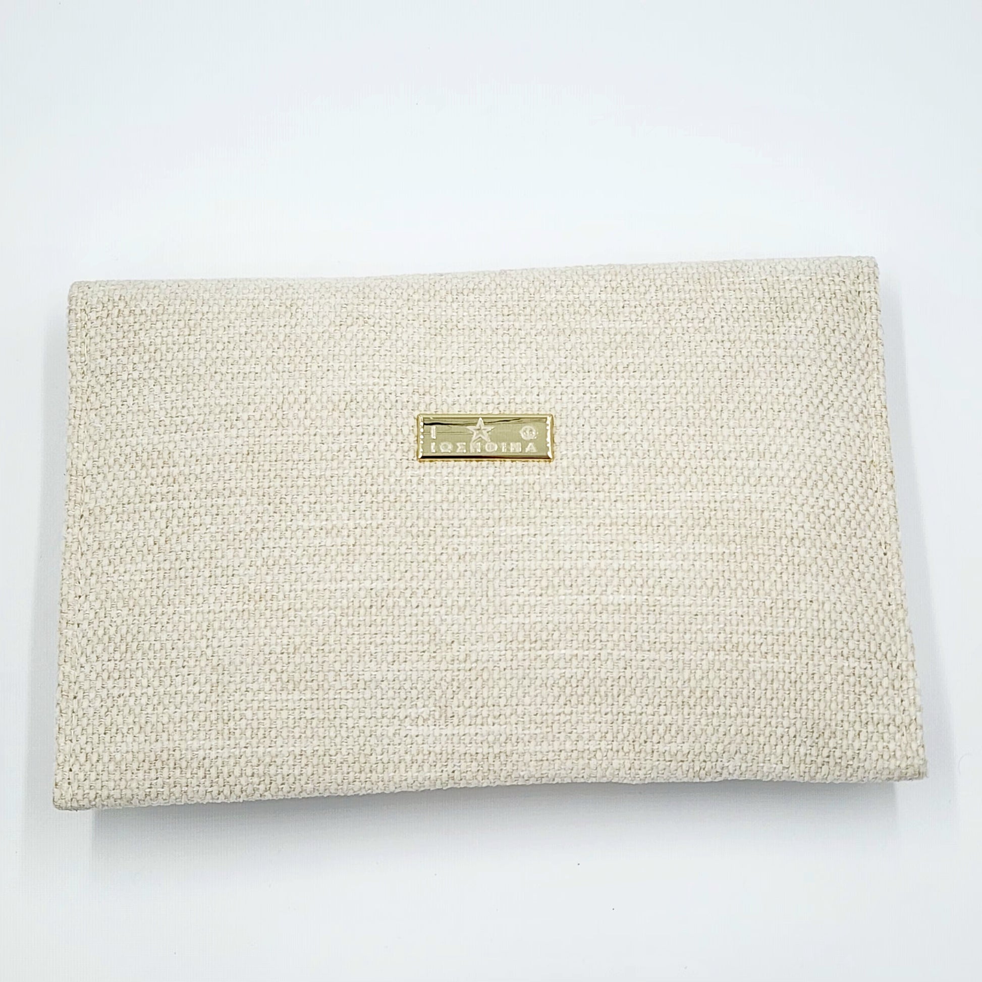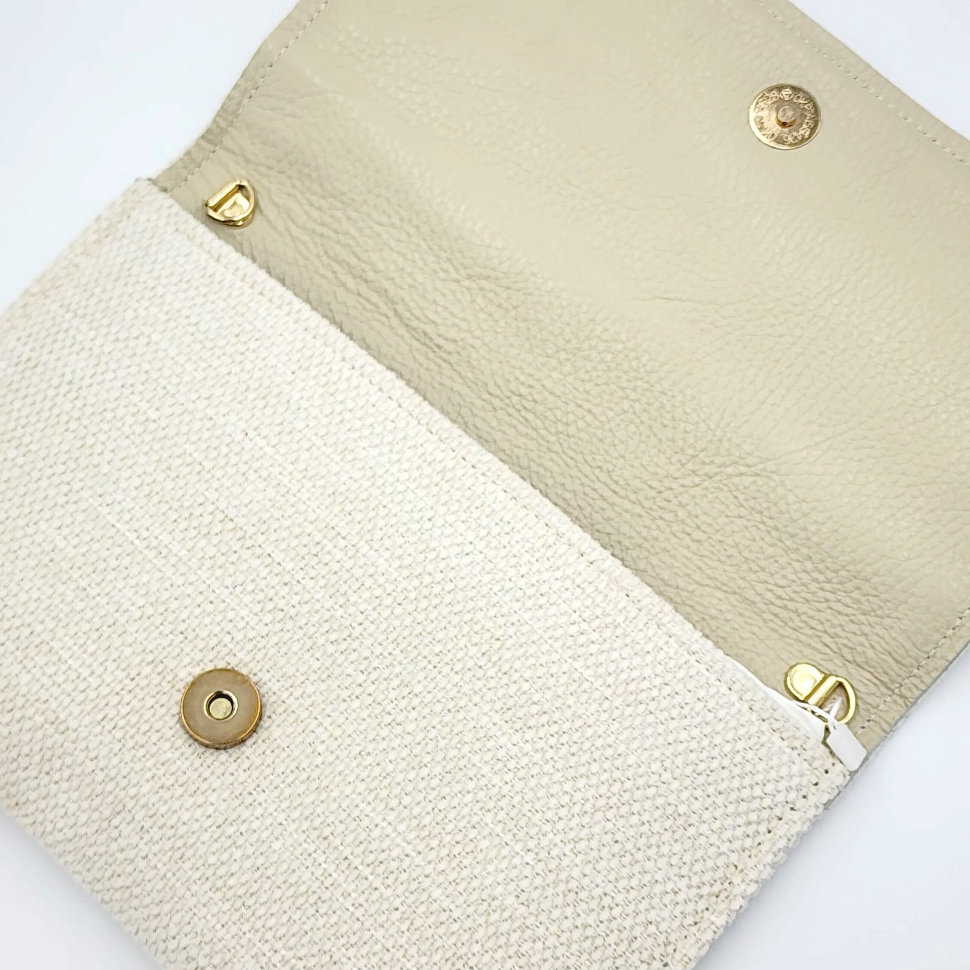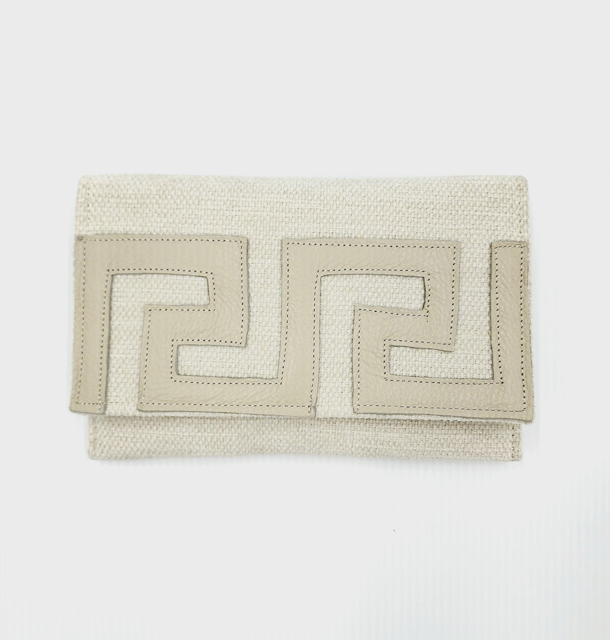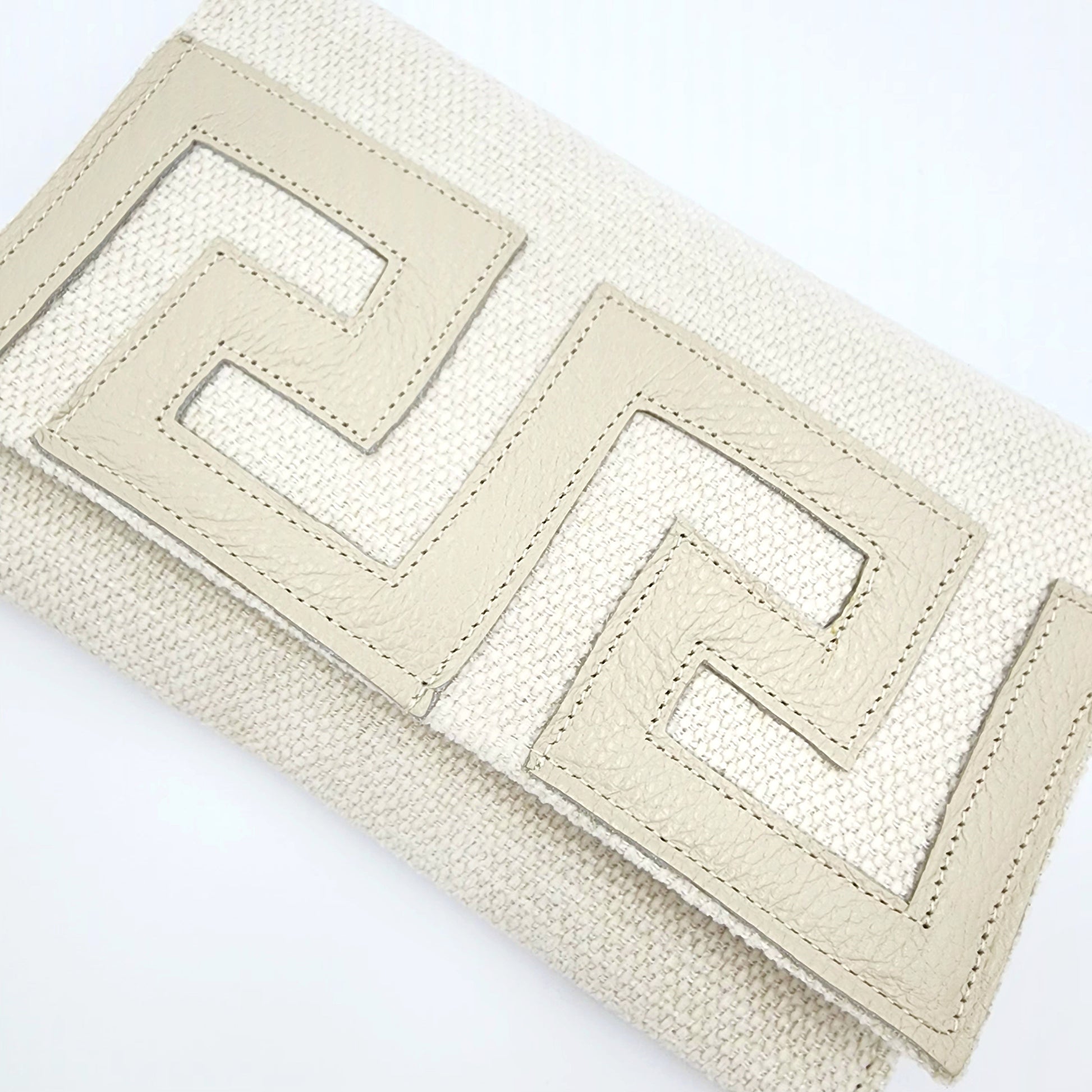 This chic beige fabric clutch featuring a striking leather meander design brings a touch of ancient Greece to your modern wardrobe.
