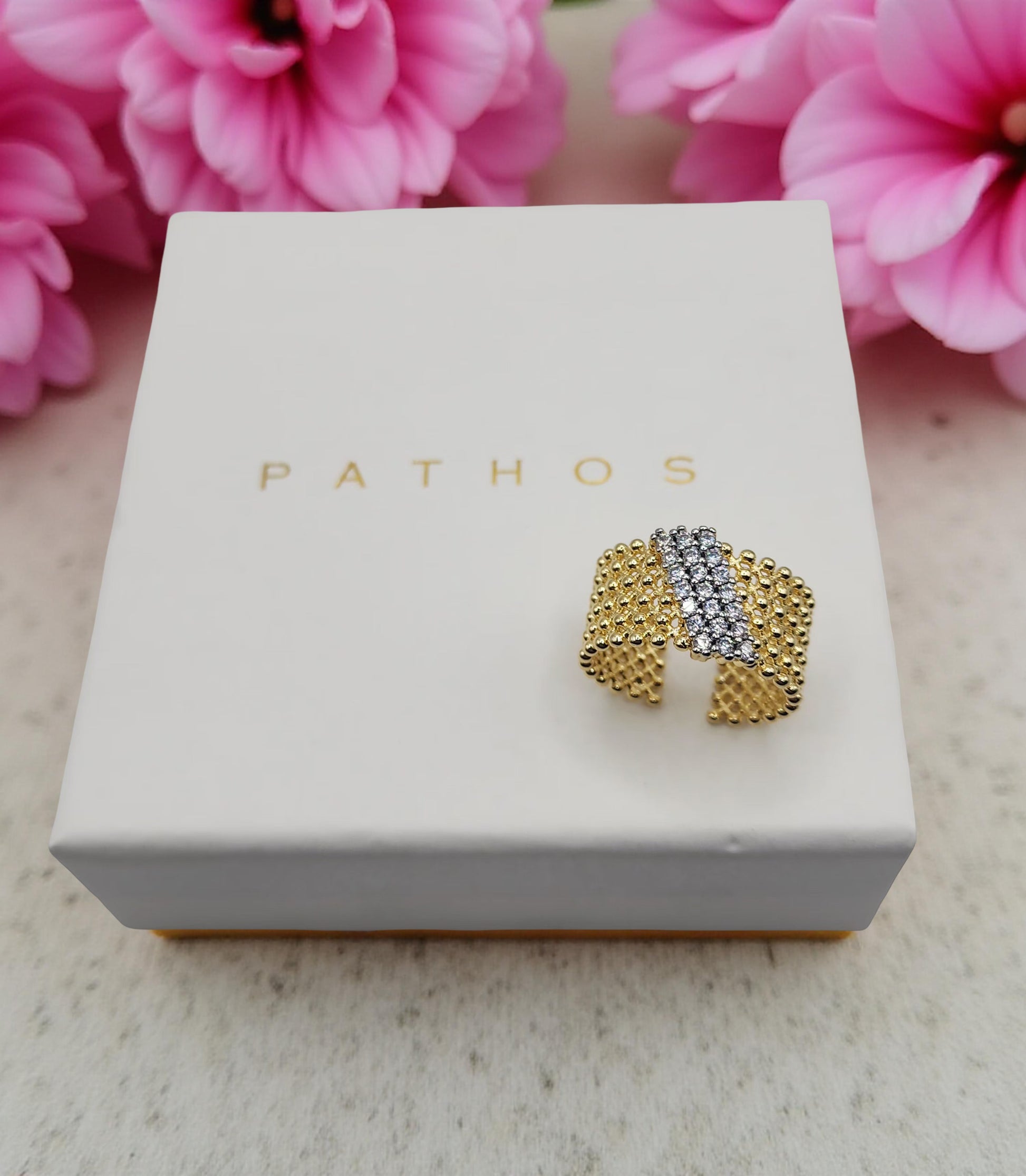 The Justina Ring by Pathos Jewellery is a modern statement piece with a beautiful textured gold band and a sparkling silver-accented centre.
