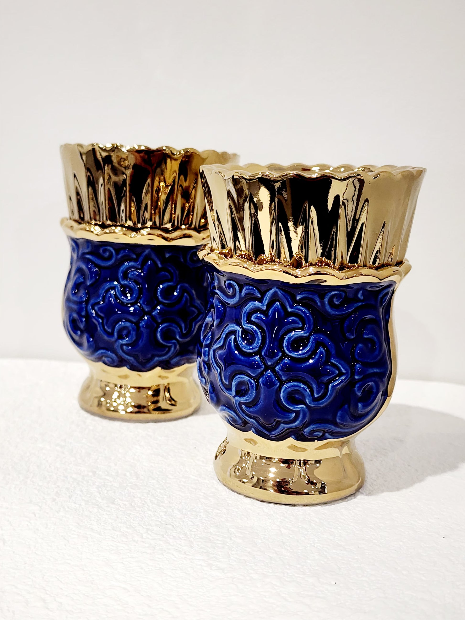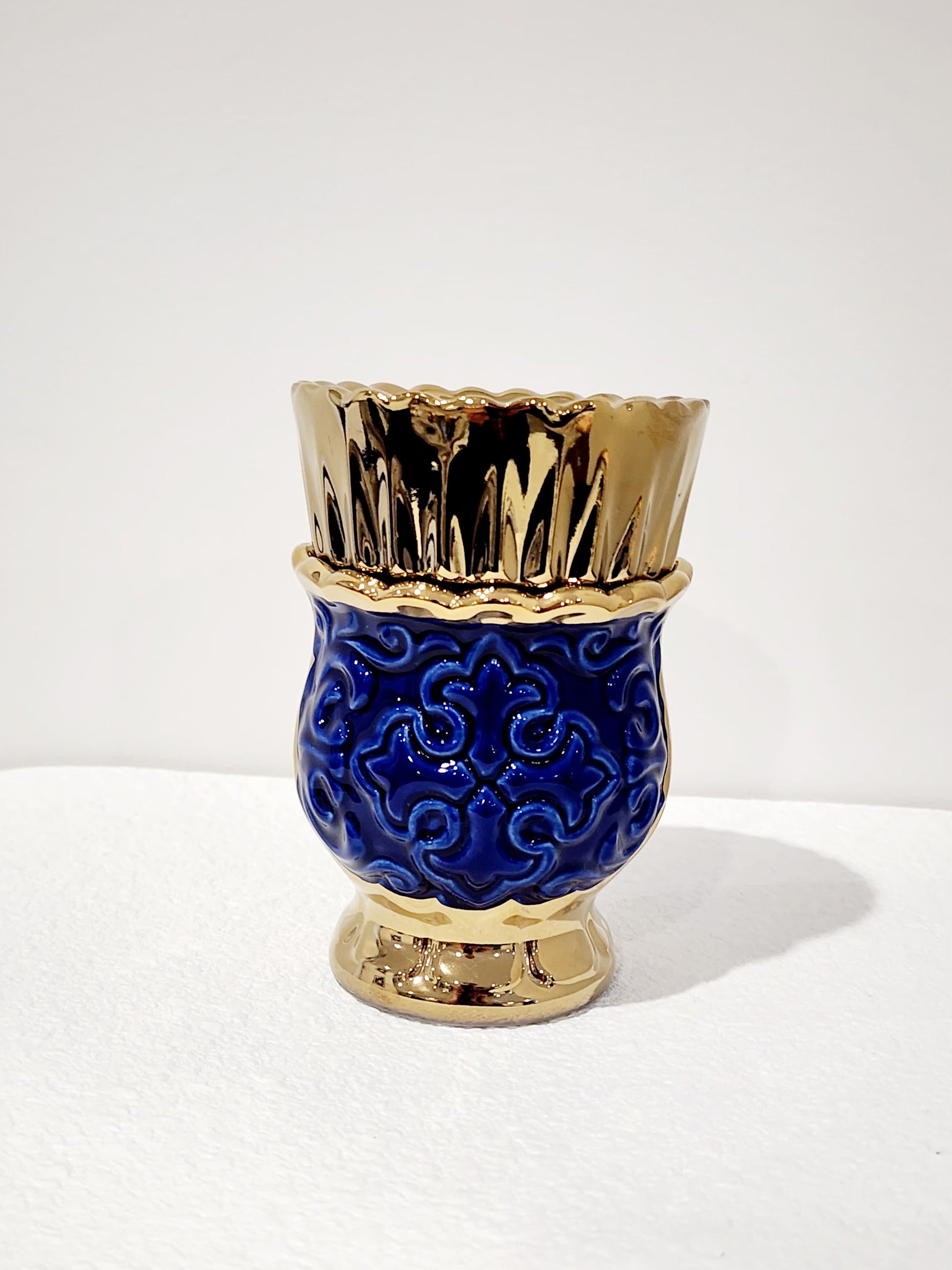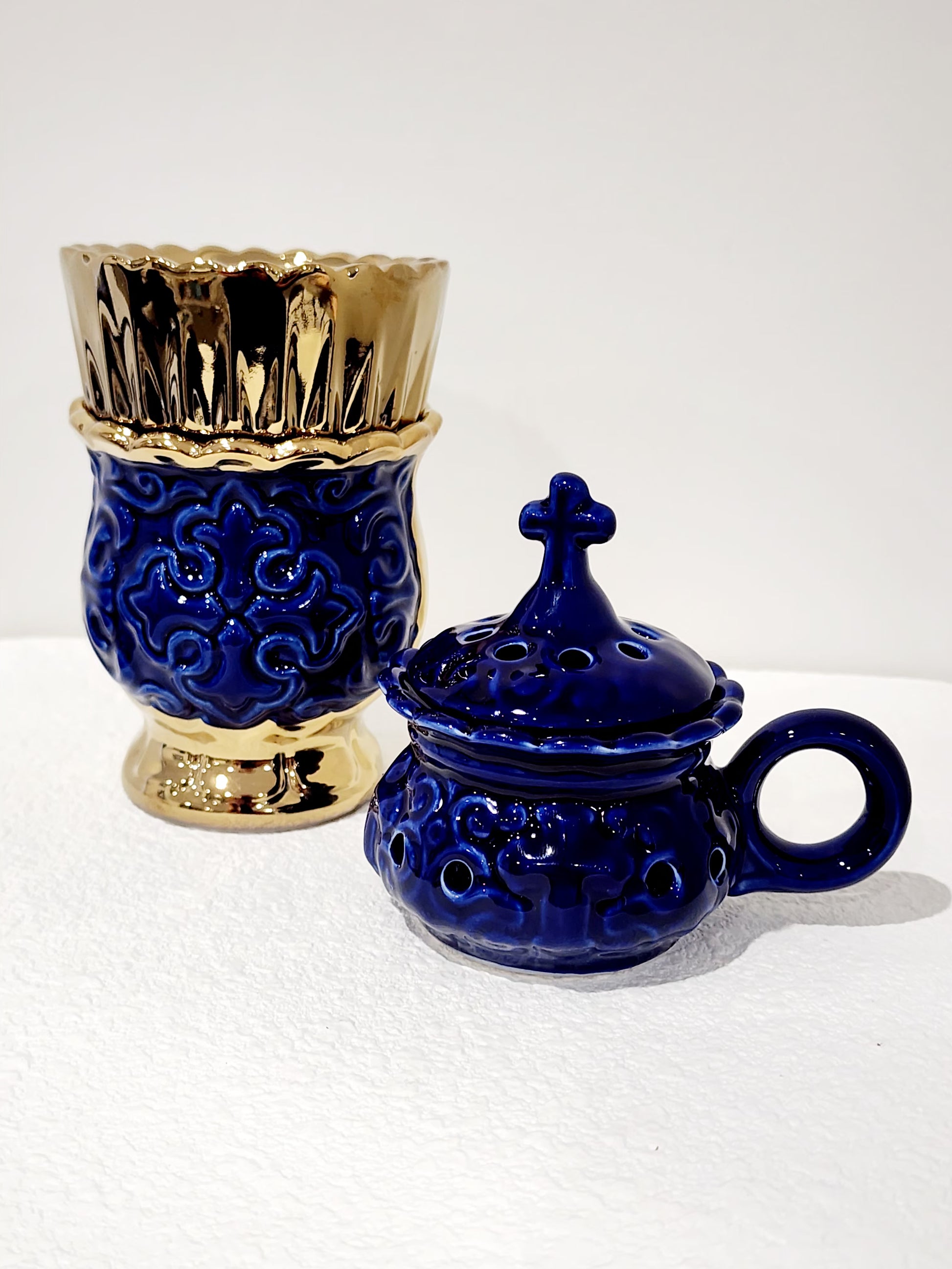 This beautiful navy blue ceramic kandili featuring a detailed cross highlighted with a glossy blue and gold finish is a graceful addition to any sacred space.
