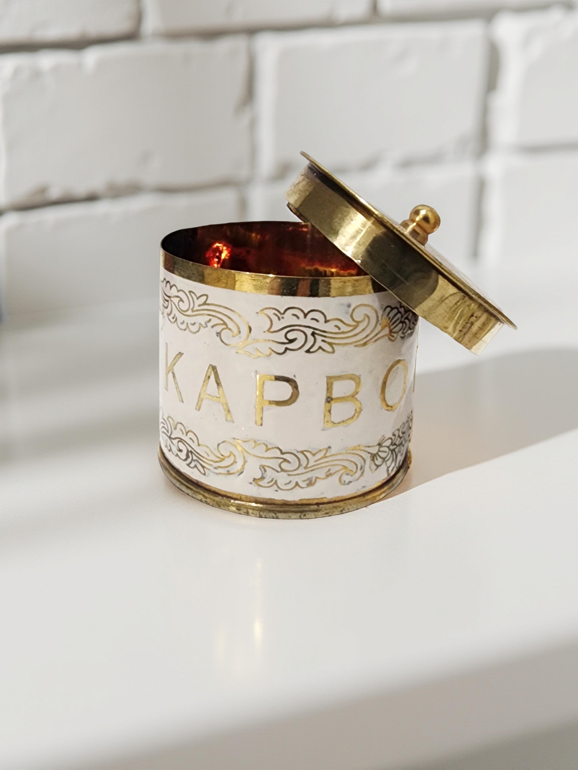 This handcrafted brass container is adorned with rich white enamel and intricate gold detailing, featuring the Greek word "ΚΑΡΒΟΥΝΑKI" (charcoal). A beautiful addition to any prayer corner.
