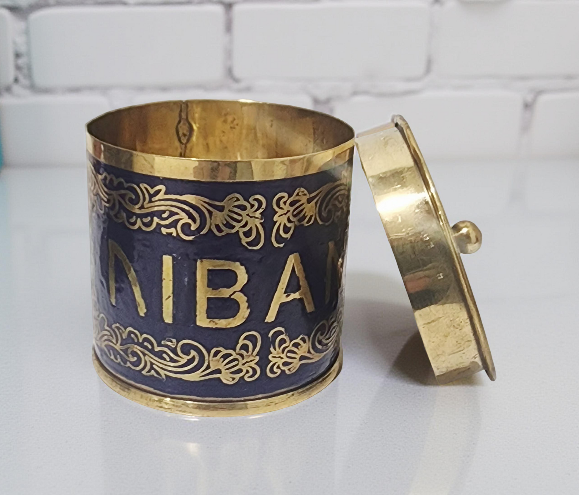 This handcrafted brass container is adorned with rich deep blue enamel and intricate gold detailing, featuring the Greek word "ΛΙΒΑΝΙ" (livani – incense). A beautiful addition to your prayer corner.