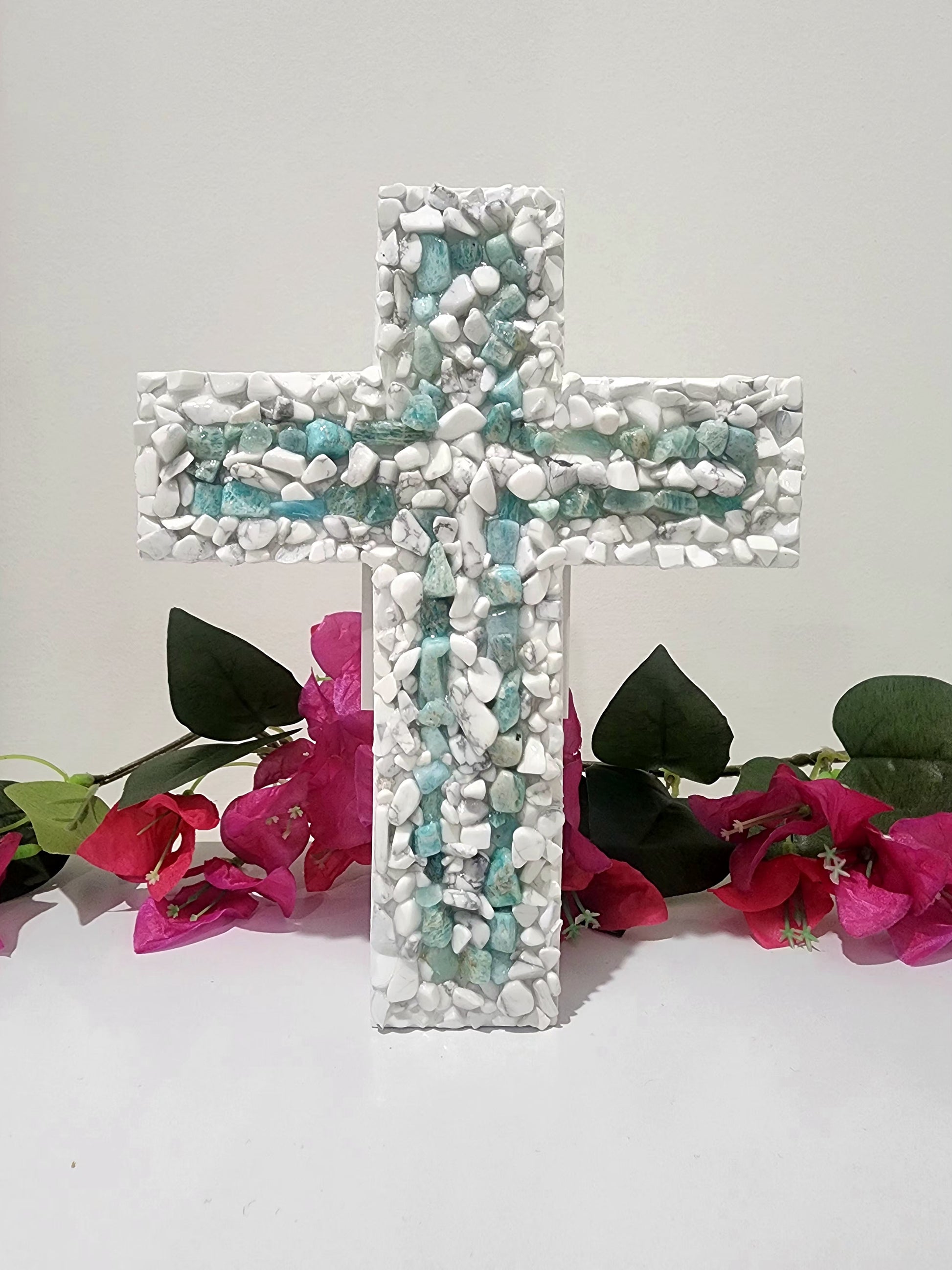 This beautiful handcrafted cross by Anesti Home features white & turquoise stones.