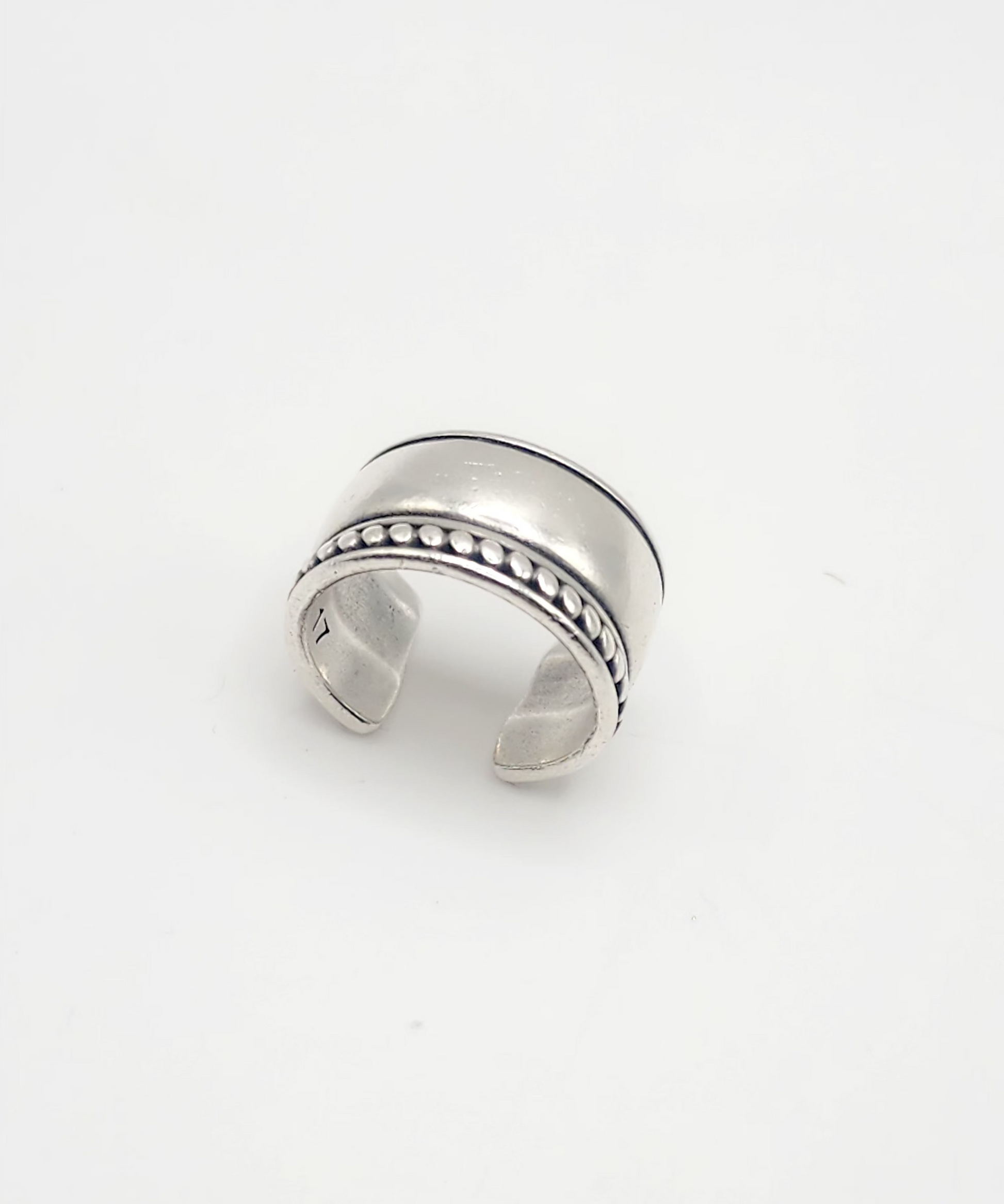 The wide band showcases a sleek, polished finish, accented by a central row of intricate beaded detailing for added charm.