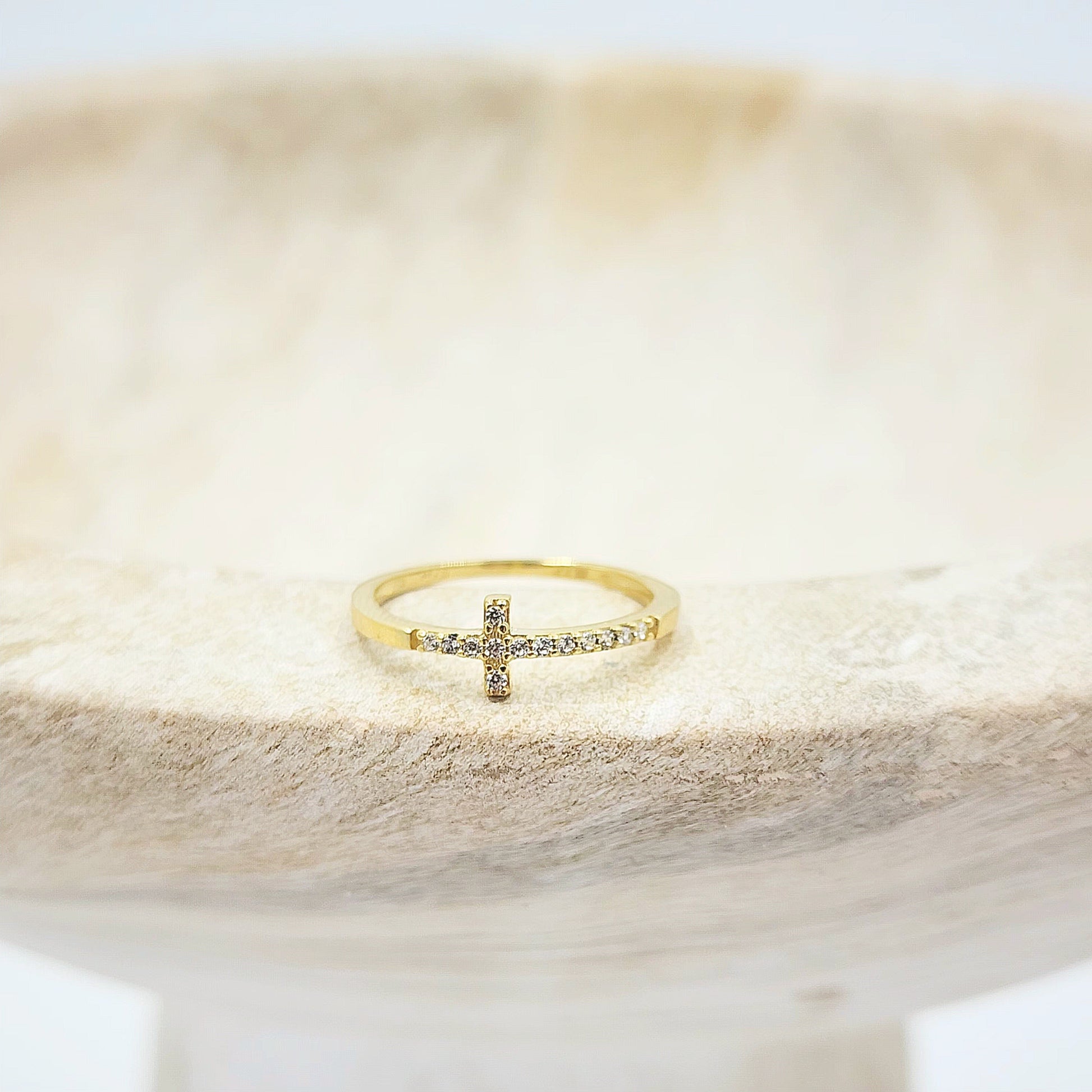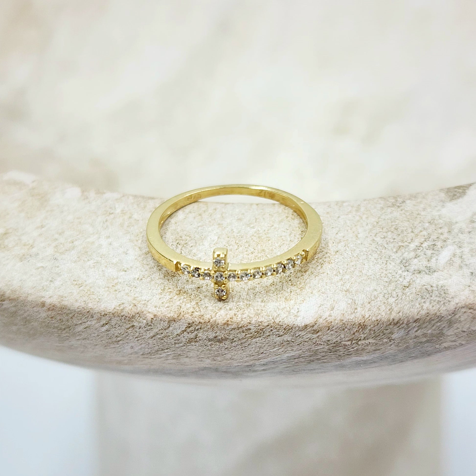 This elegant 9ct yellow gold ring features a delicate cross adorned with sparkling cubic zirconia's.