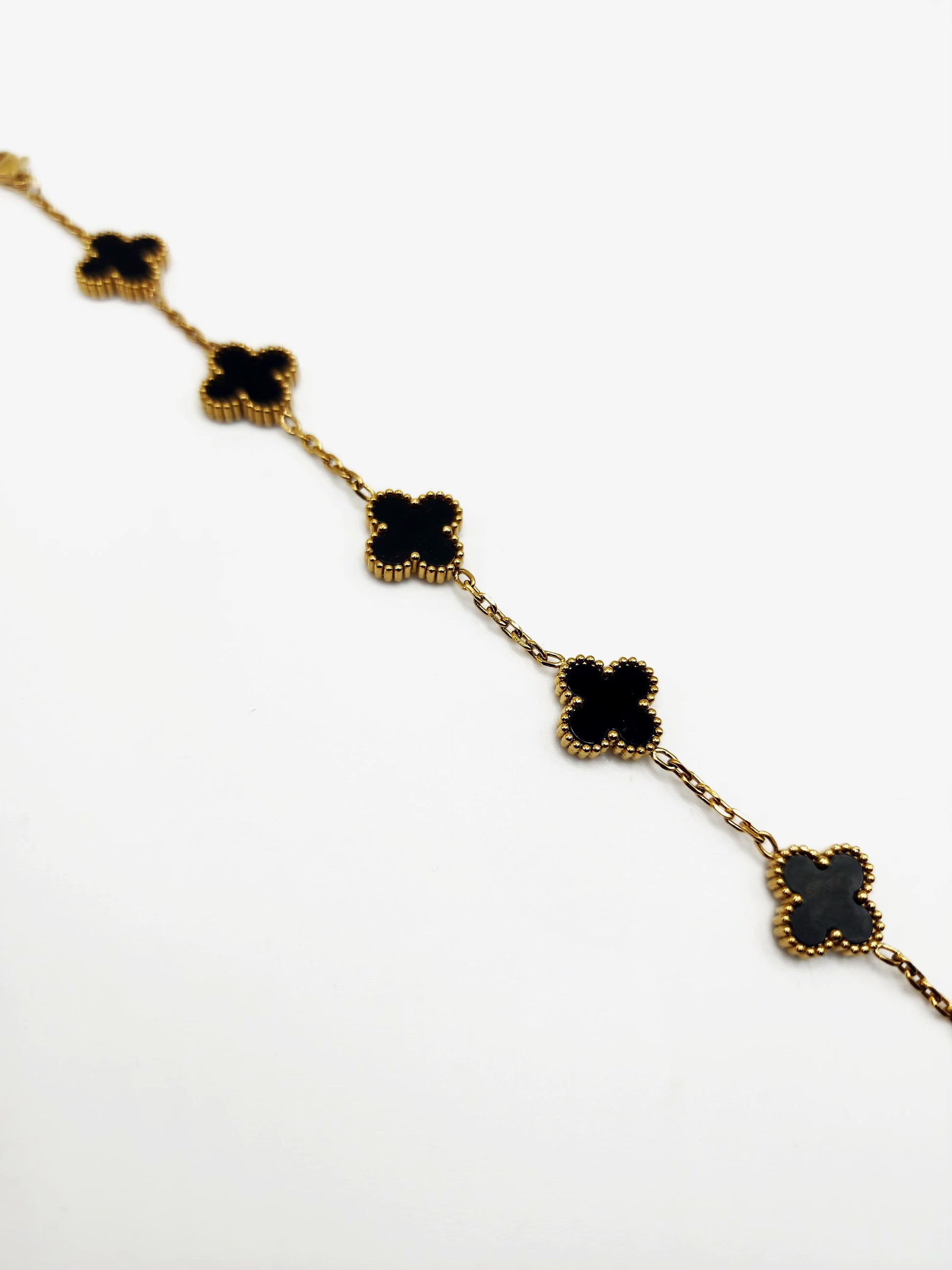 Featuring a delicate 18k gold-plated chain and five striking black clover-shaped charm, this piece embodies sophistication and minimalism. The finely detailed beaded edges of the pendant add a touch of refinement, making it perfect for both everyday wear and special occasions.