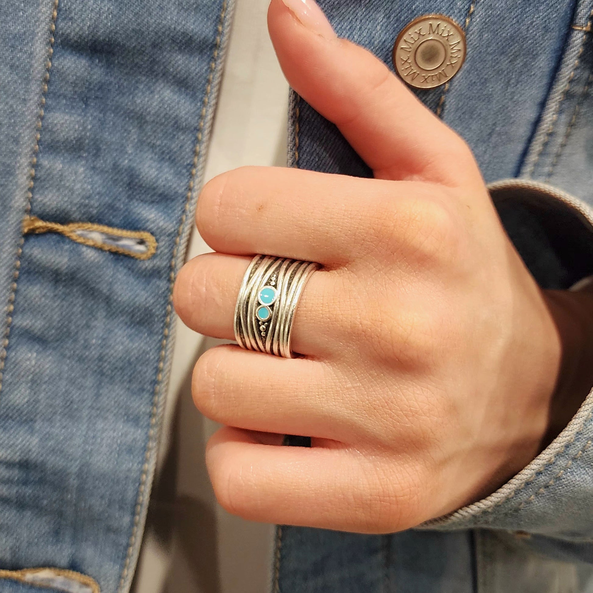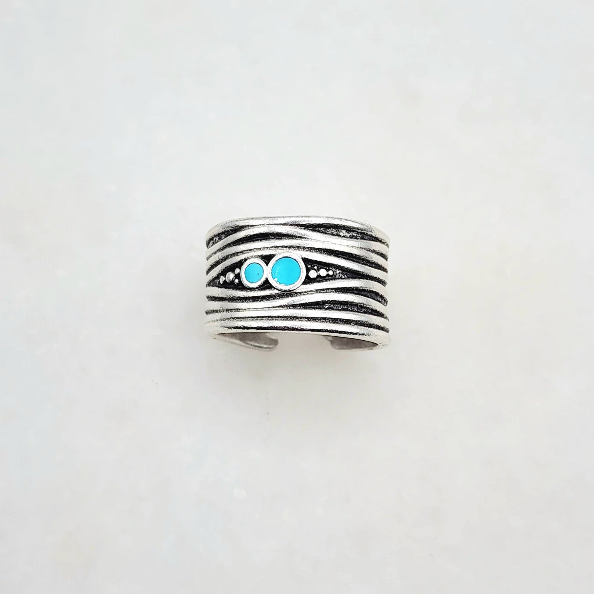 This bold adjustable ring features vibrant turquoise enamel on a textured silver band.