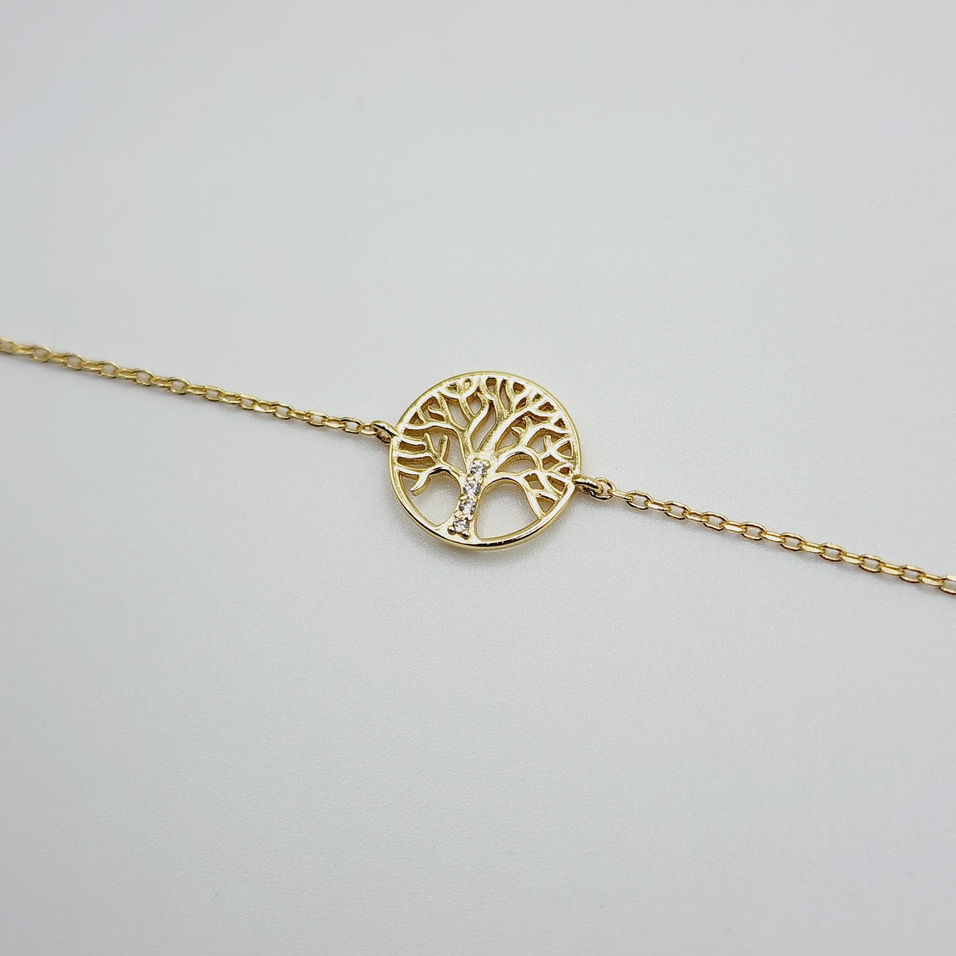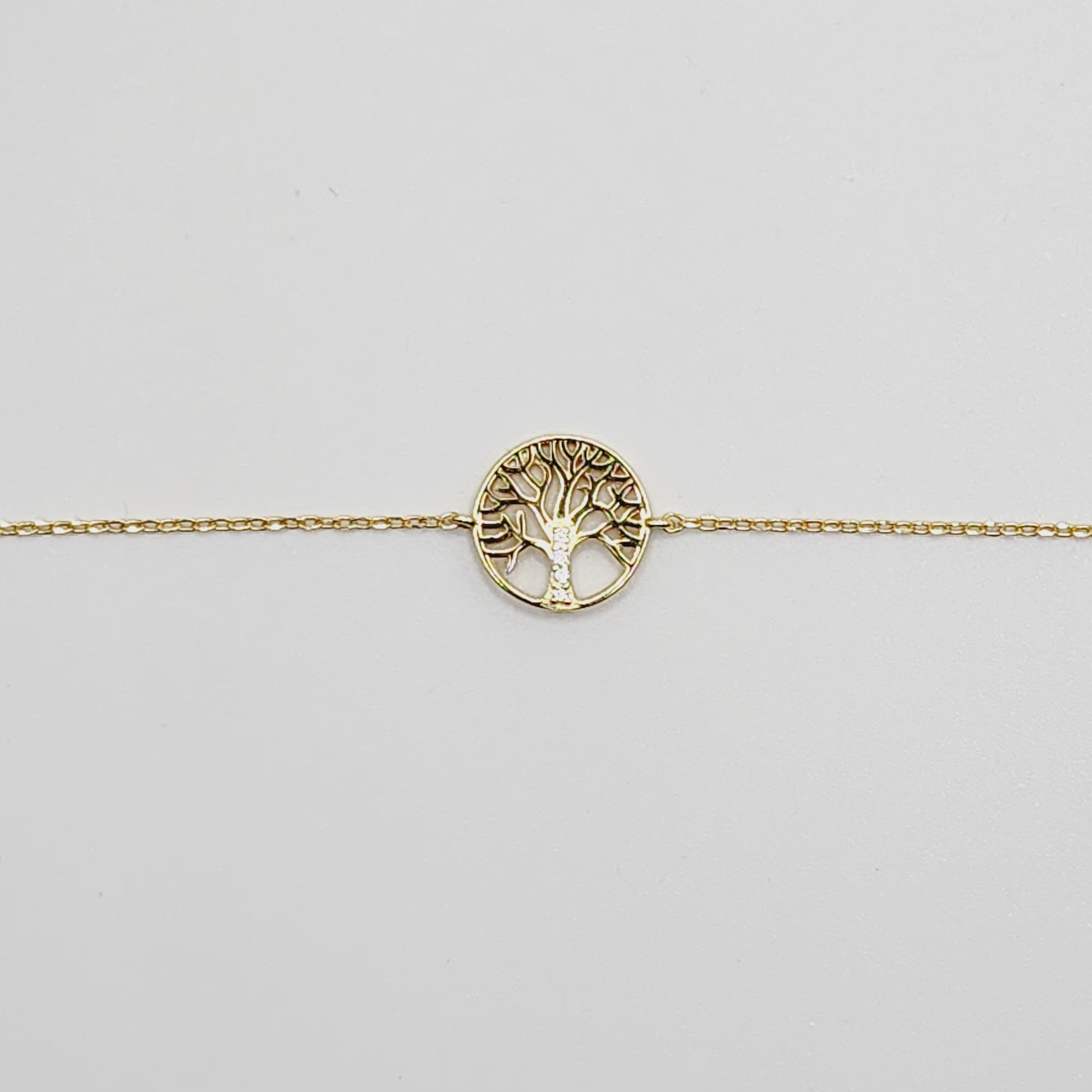 Elevate your style with our gold plated Tree of Life bracelet, featuring three shimmering zircon stones along the trunk.