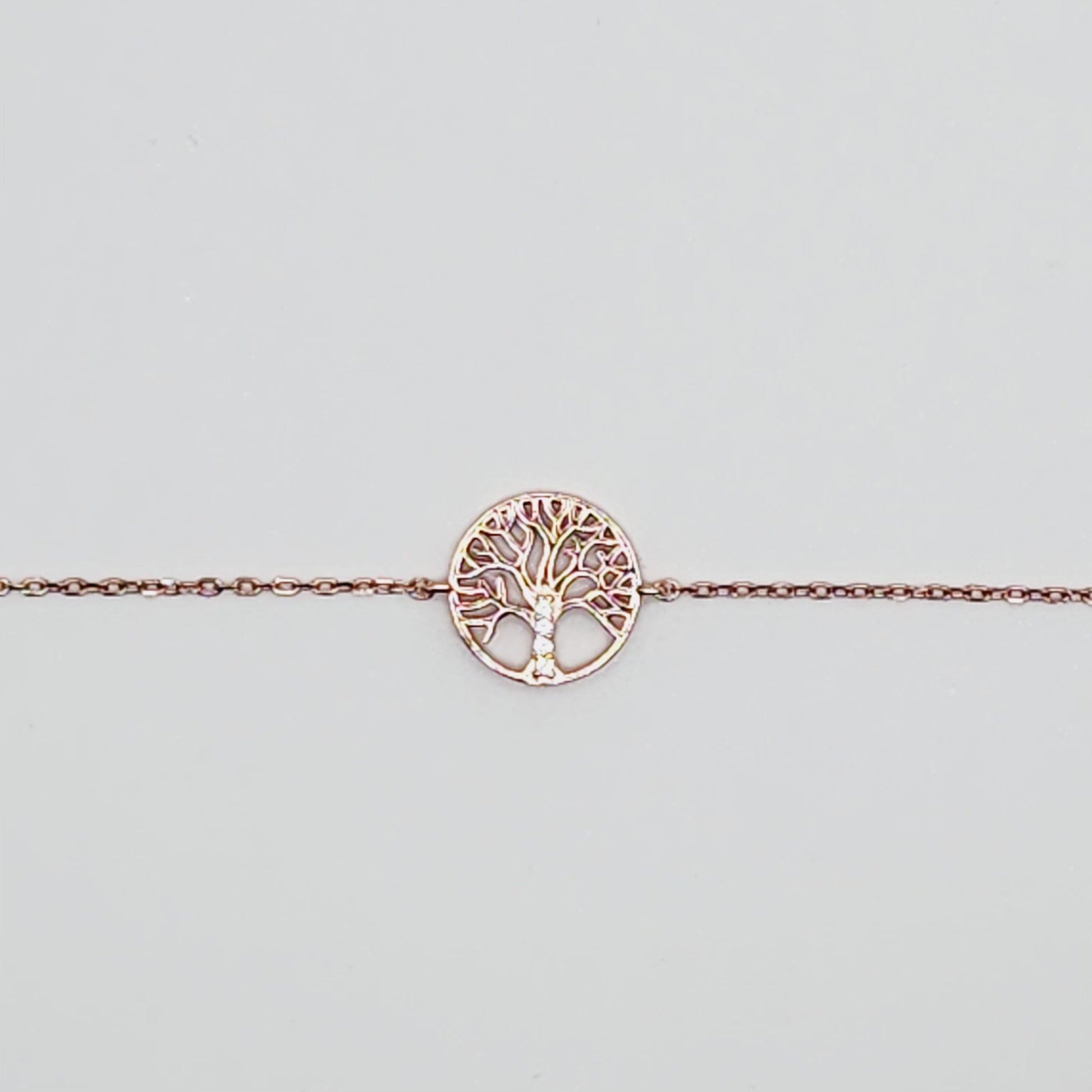 Elevate your style with our rose gold plated Tree of Life bracelet, featuring three shimmering zircon stones along the trunk.
